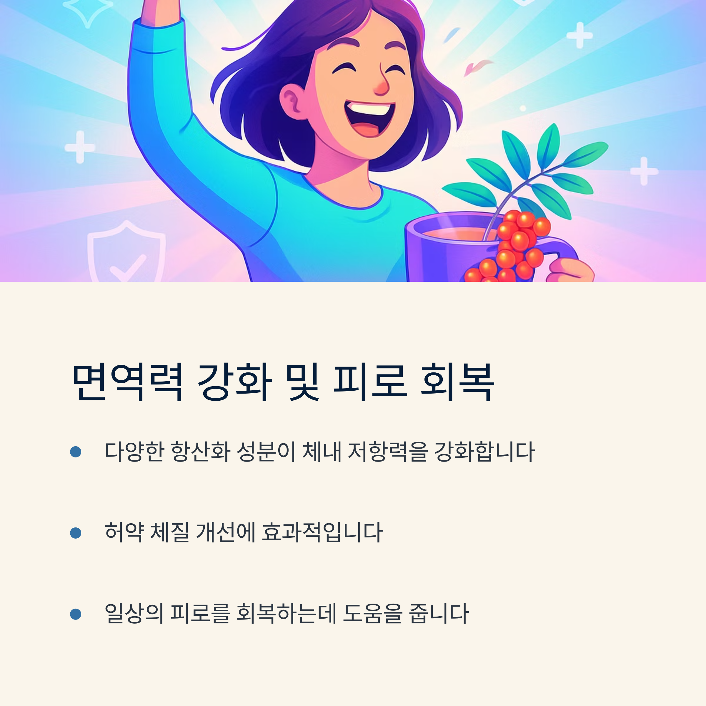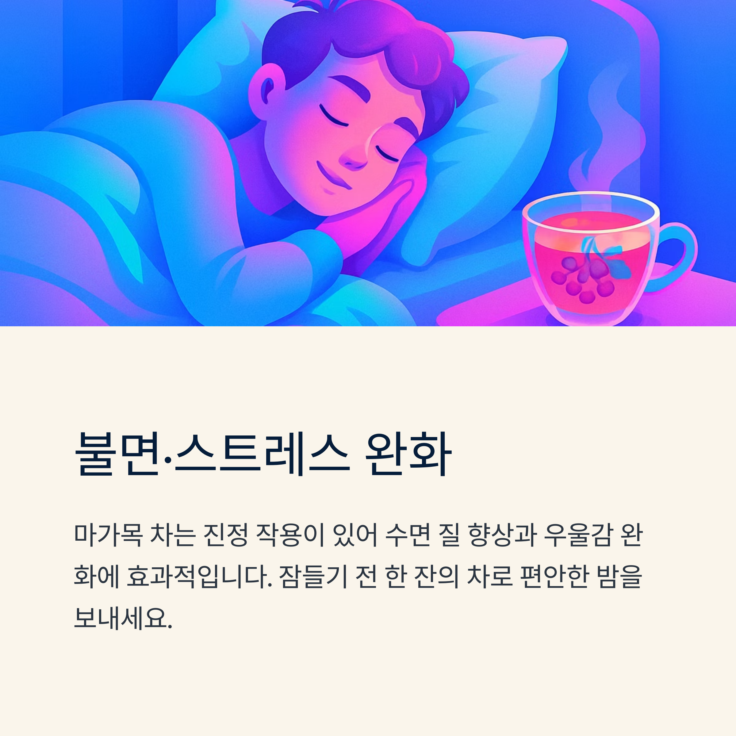 - 마가목 차는 진정 작용이 있어 수면 질 향상, 우울감 완화에 효과적