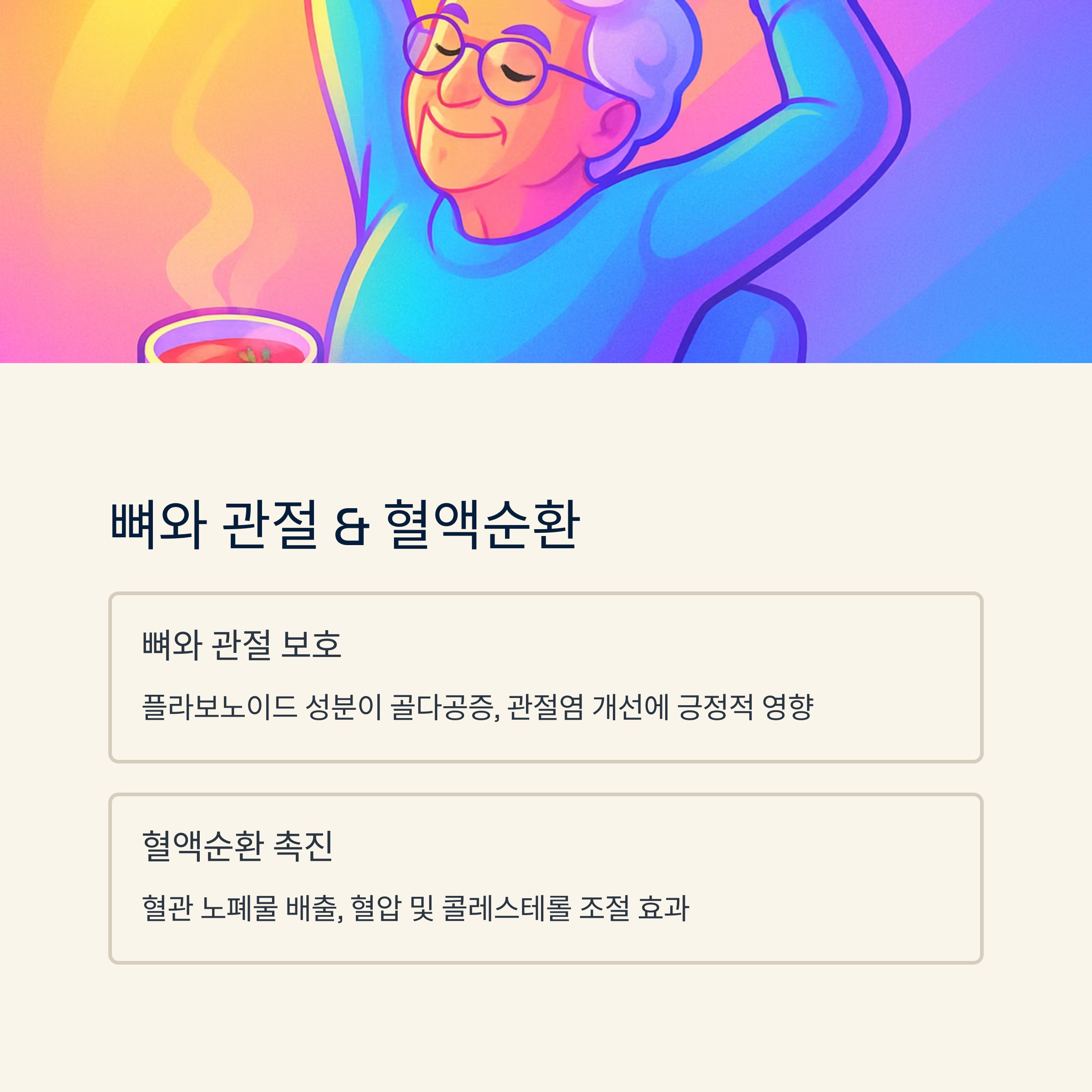 - 플라보노이드 성분이 골다공증, 관절염 개선에 긍정적