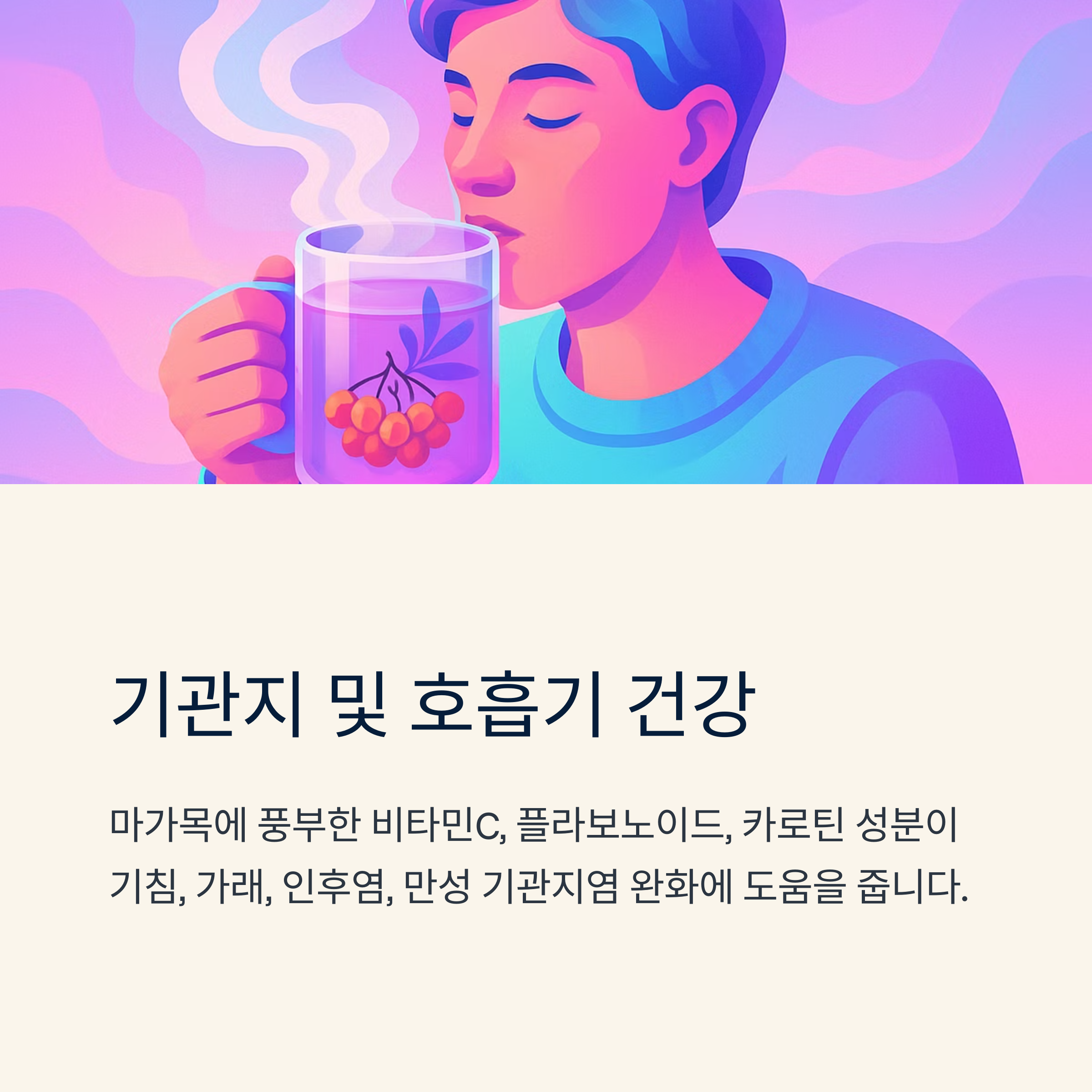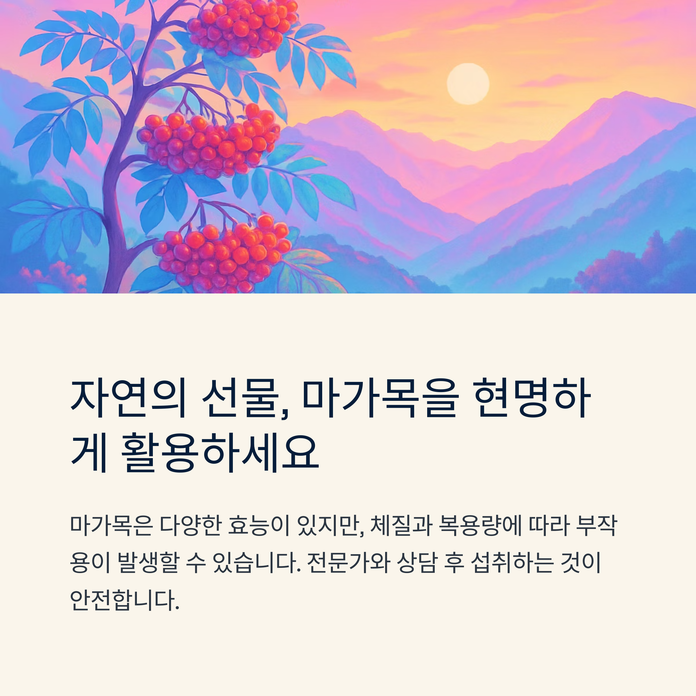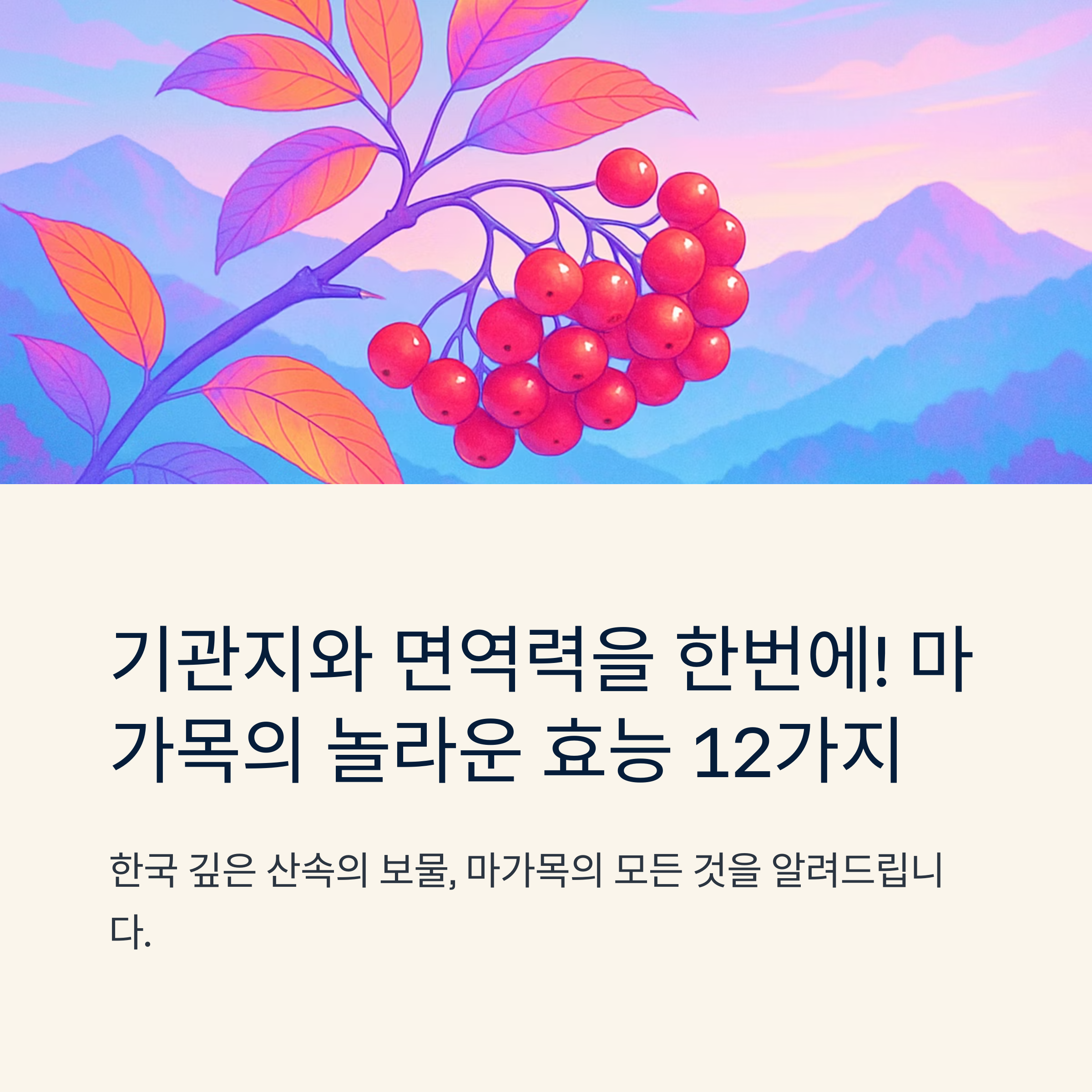 마가목은 기관지·호흡기 건강부터 면역력, 피부, 뼈, 혈액순환, 위장 기능까지 두루 돕는 천연 약용식물입니다. 하지만 체질과 복용량에 따라 부작용이 발생할 수 있어, 전문가와 상담 후 섭취하는 것이 안전합니다.