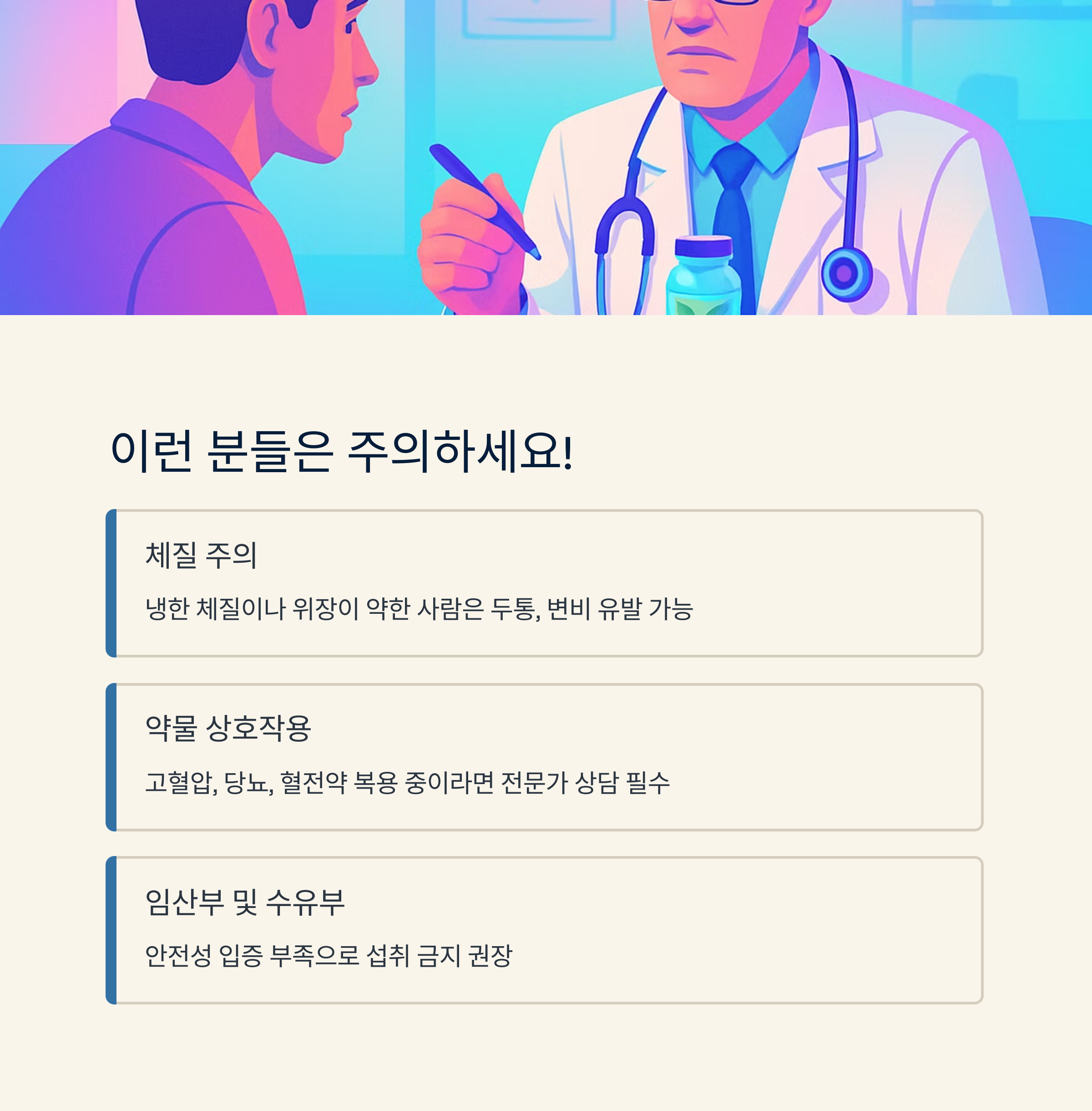 - 고혈압, 당뇨, 혈전약 복용 중이라면 전문가 상담 필수