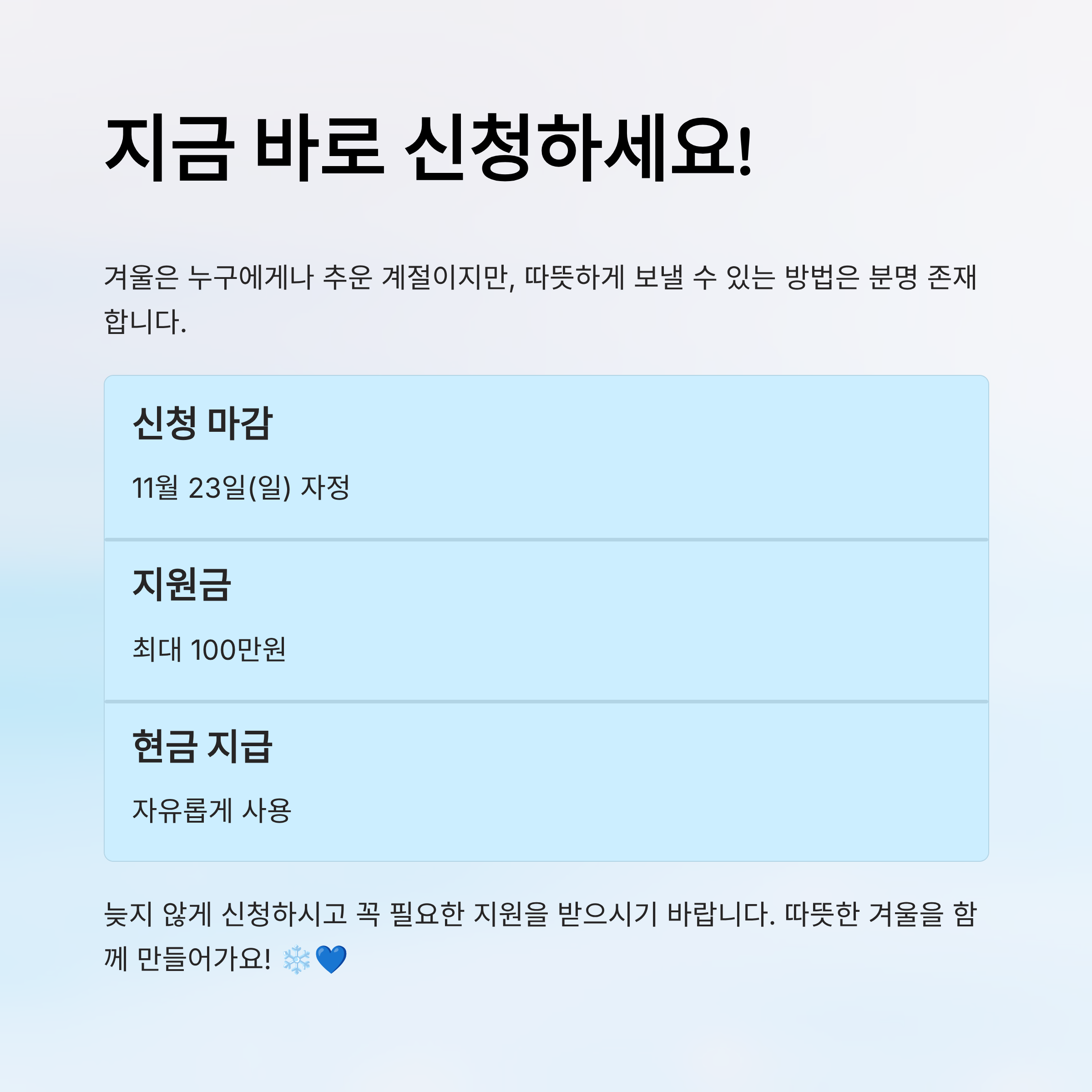 - 목적: 에너지 소외계층의 겨울철 난방비 부담 완화 및 복지 향상