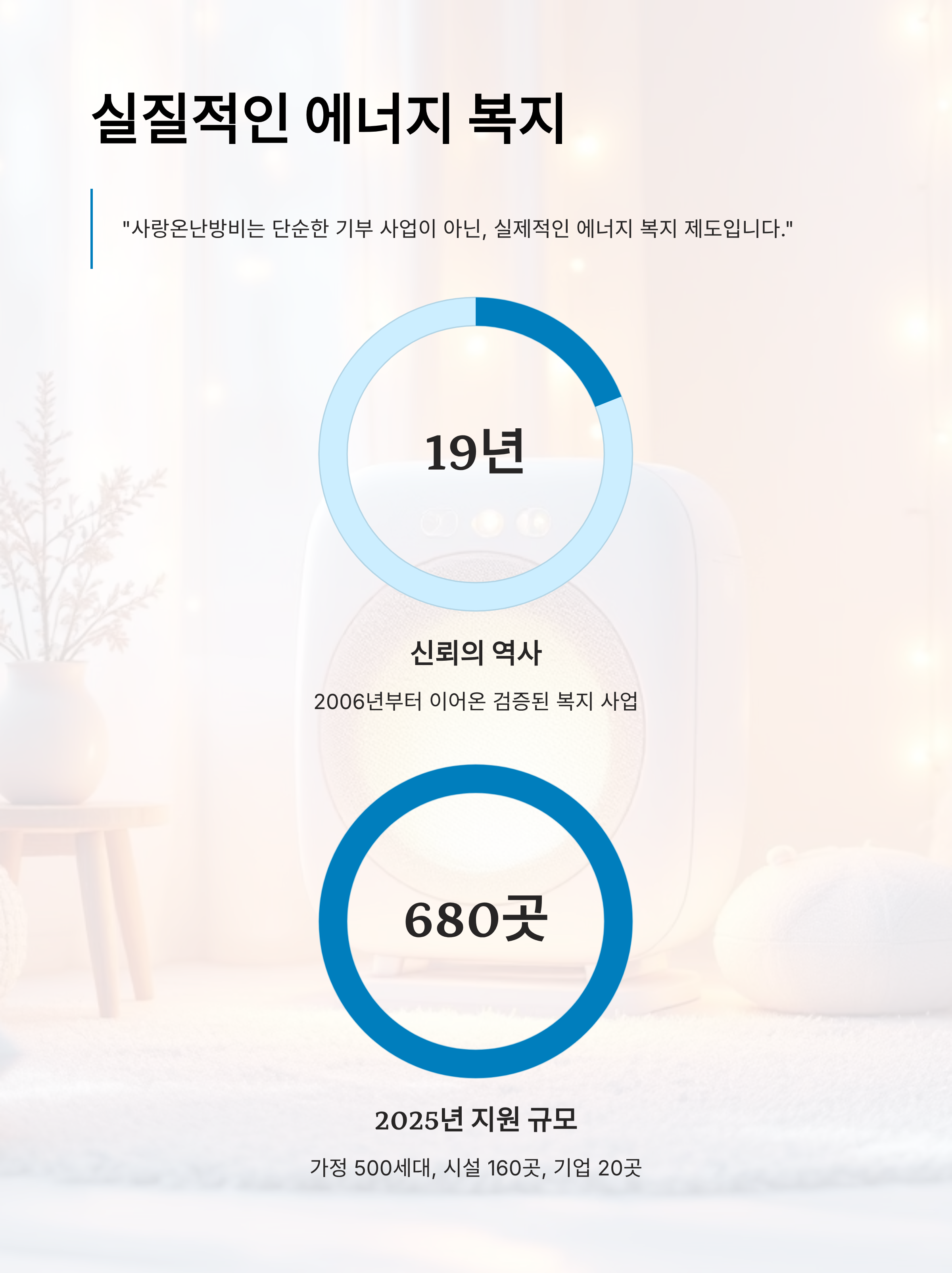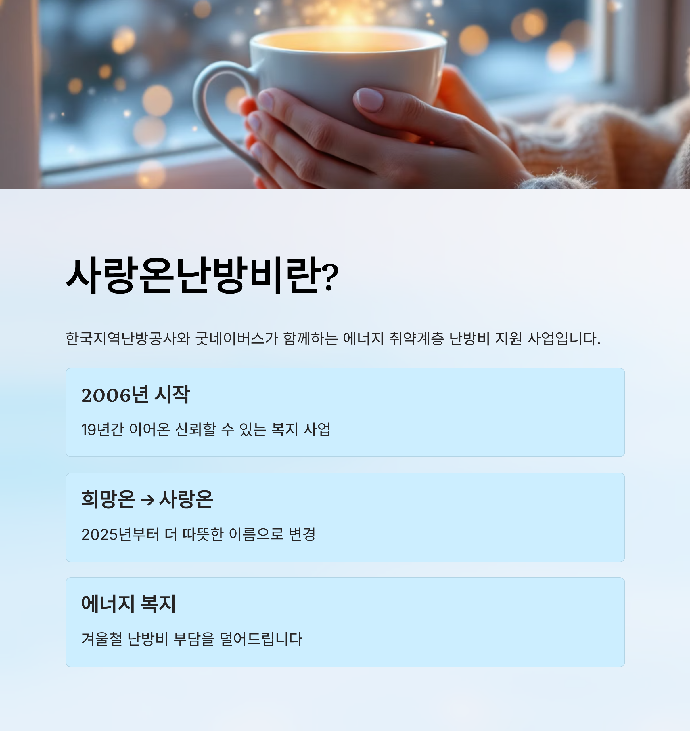 겨울은 누구에게나 추운 계절이지만, 따뜻하게 보낼 수 있는 방법은 분명 존재합니다. 사랑온난방비는 단순한 기부 사업이 아닌, 실제적인 에너지 복지 제도입니다.