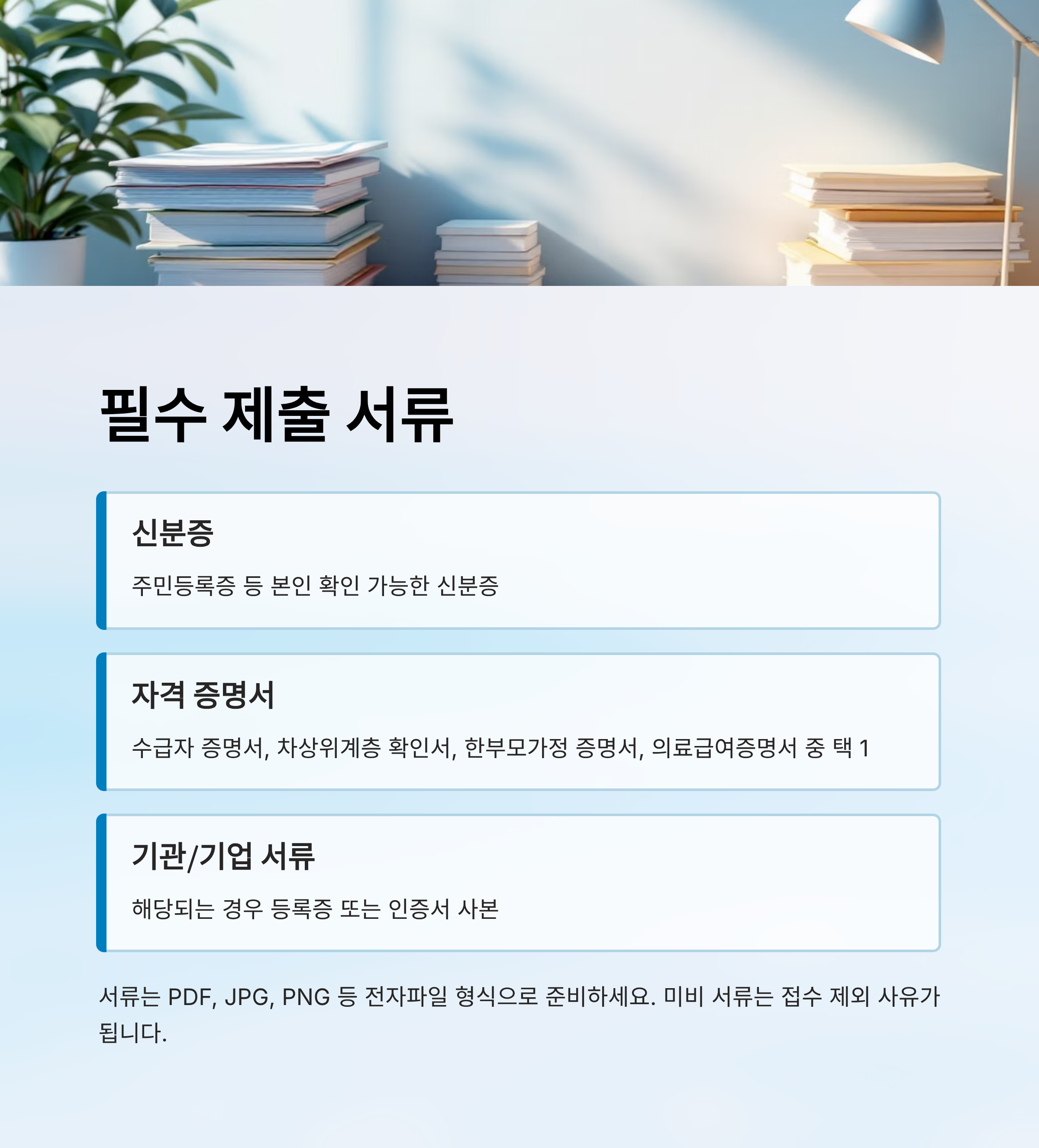 제출 서류의 세부 기준은 공식 홈페이지에 상세히 안내되어 있습니다. 미비 서류는 접수 제외 사유가 되니 반드시 체크하세요.
