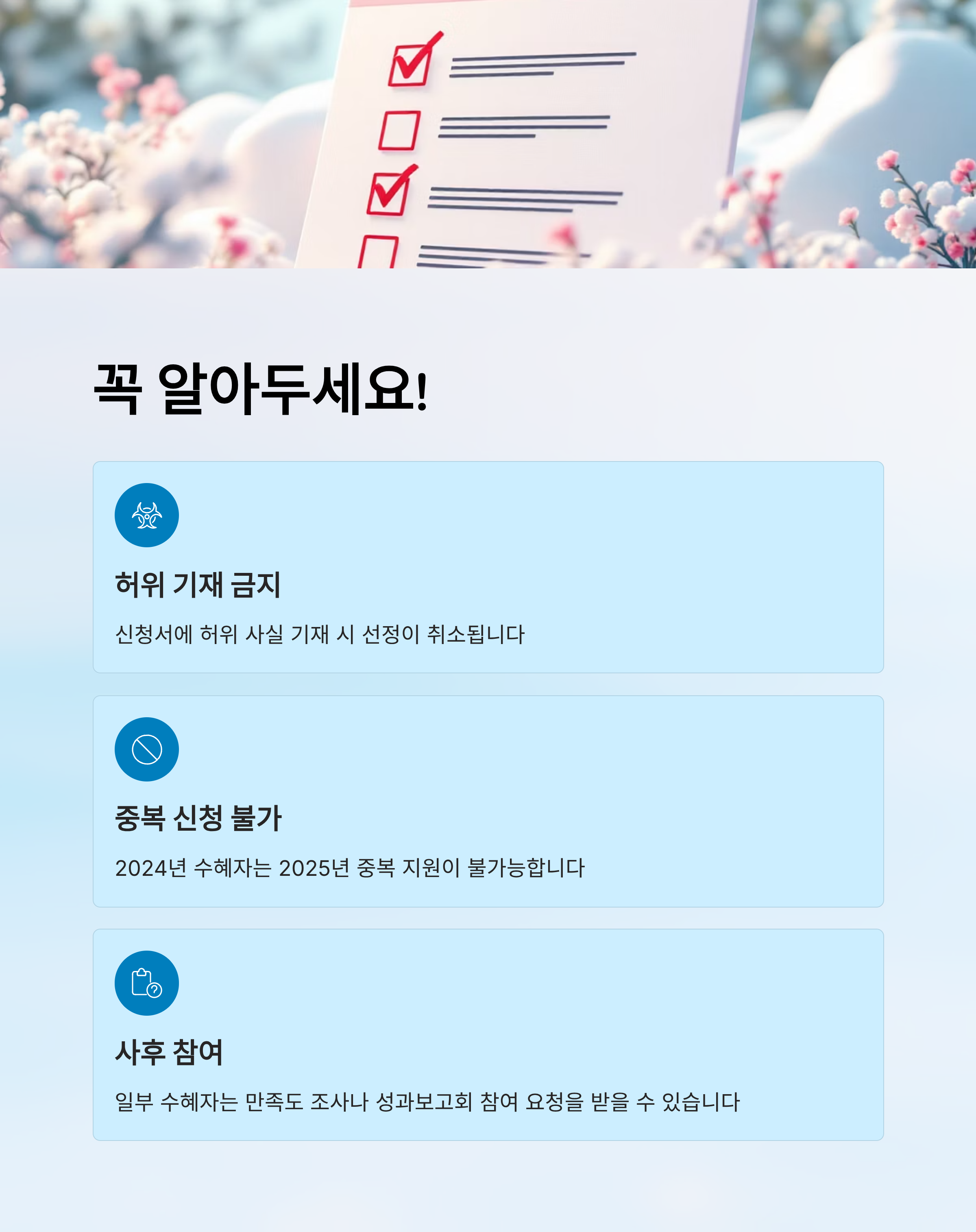 - 2024년 기존 수혜자는 2025년 중복지원 불가