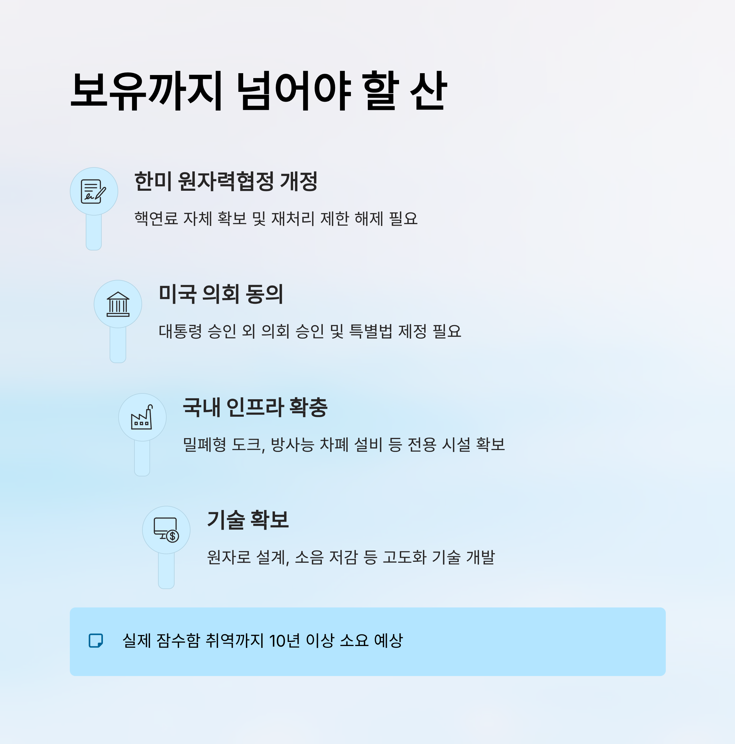 이번 정상회담에서 트럼프 대통령이 구두로 핵잠수함 건조를 승인했지만, 실제 추진까지는 넘어야 할 산이 많습니다.