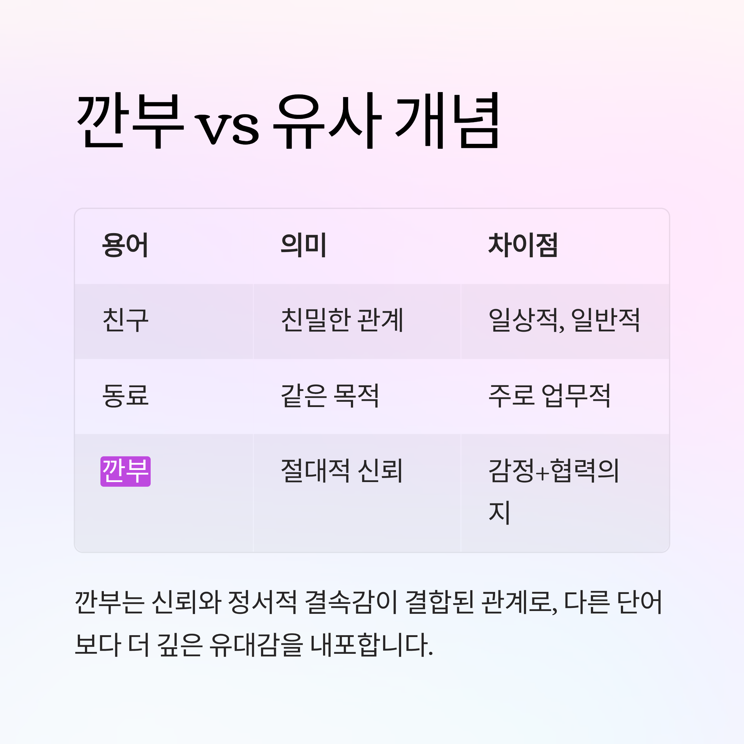 | 깐부 | 절대적 신뢰와 협력 관계 | 감정적 유대감 + 협력의지 포함 |
