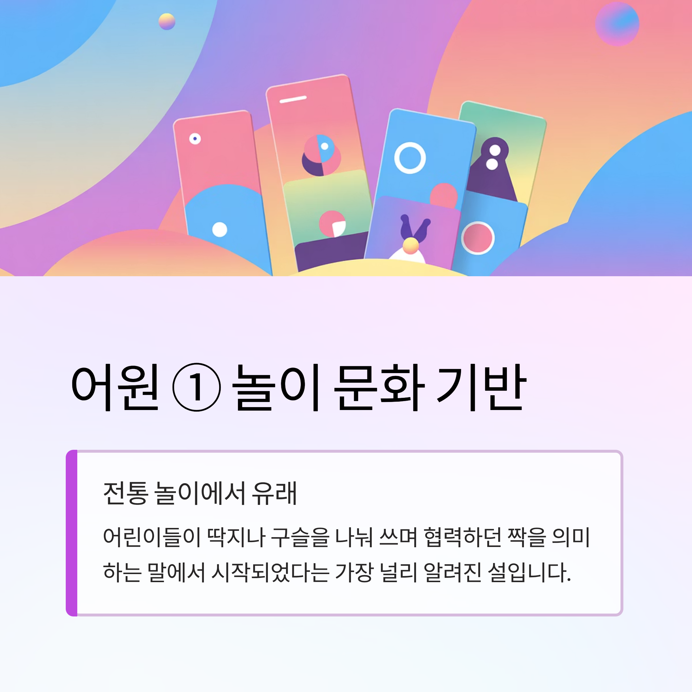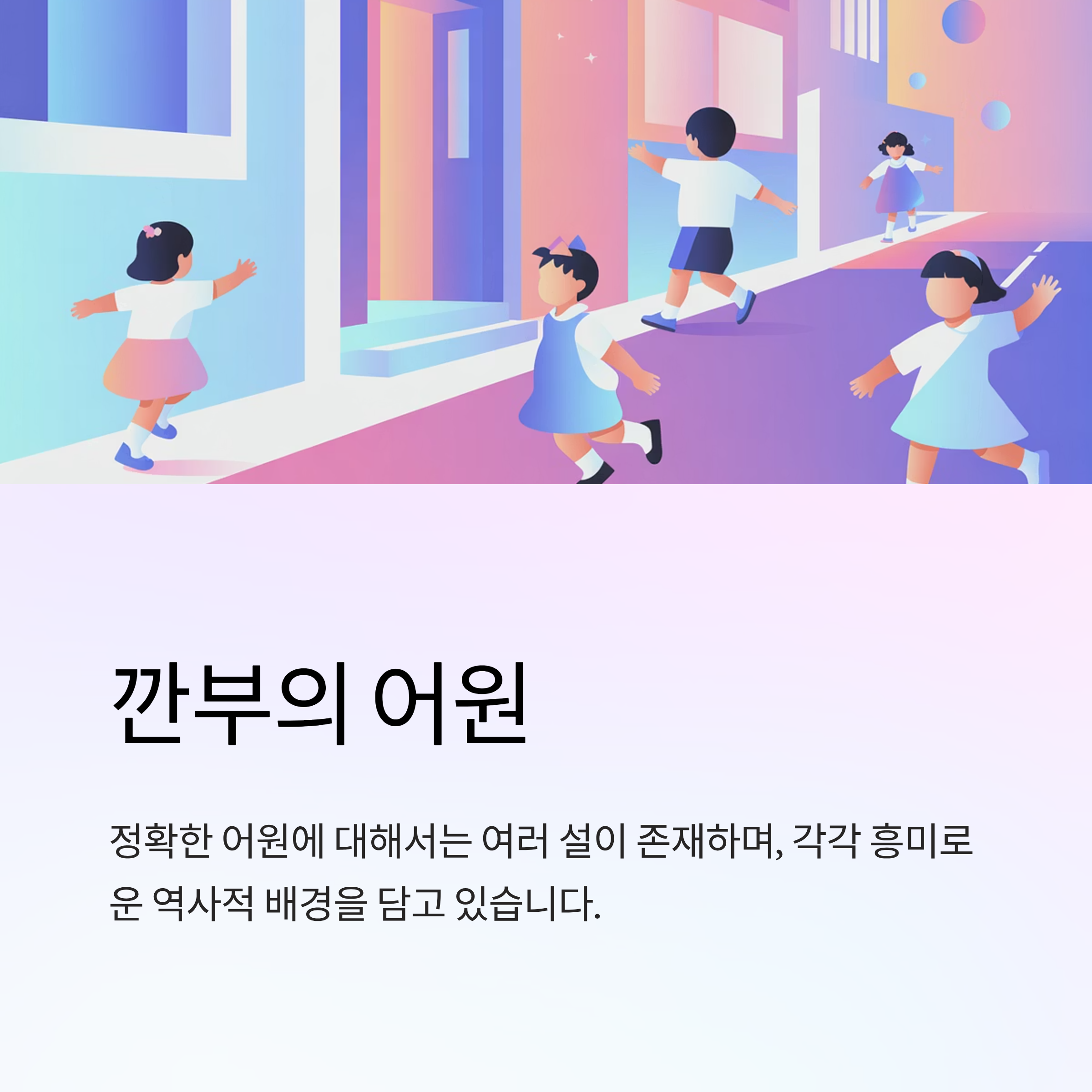 가장 널리 알려진 어원은 어린이들의 전통 놀이에서 자원을 공유하던 관계에서 유래했다는 설입니다. 이때의 ‘깐부’는 함께 딱지를 치거나 구슬을 나눠 쓰며 협력하던 짝을 의미합니다.