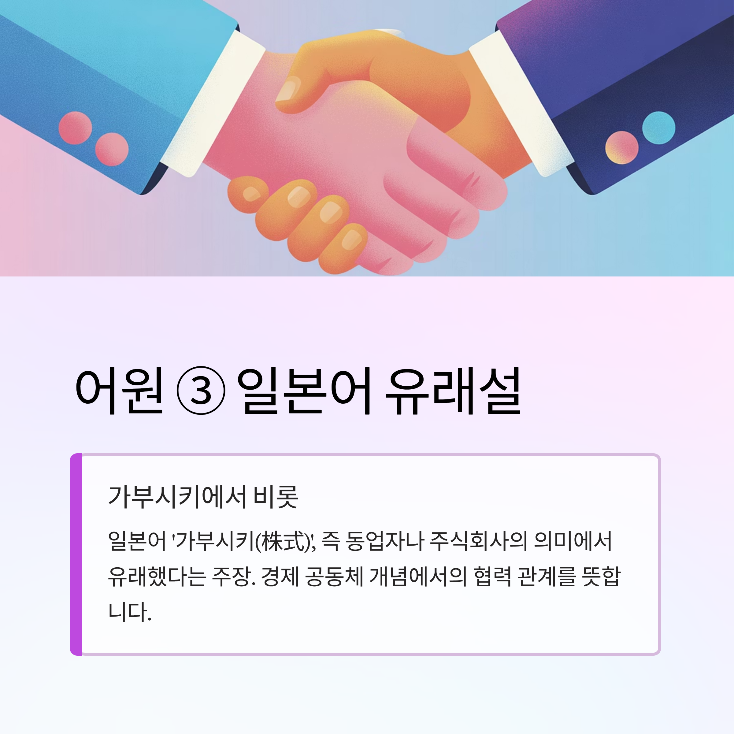 또 다른 설은 일본어 ‘가부시키(株式)’, 즉 동업자 또는 주식회사의 의미에서 비롯되었다는 주장입니다. 이는 경제 공동체나 조합 같은 협력 개념에서의 유래일 가능성을 말합니다.