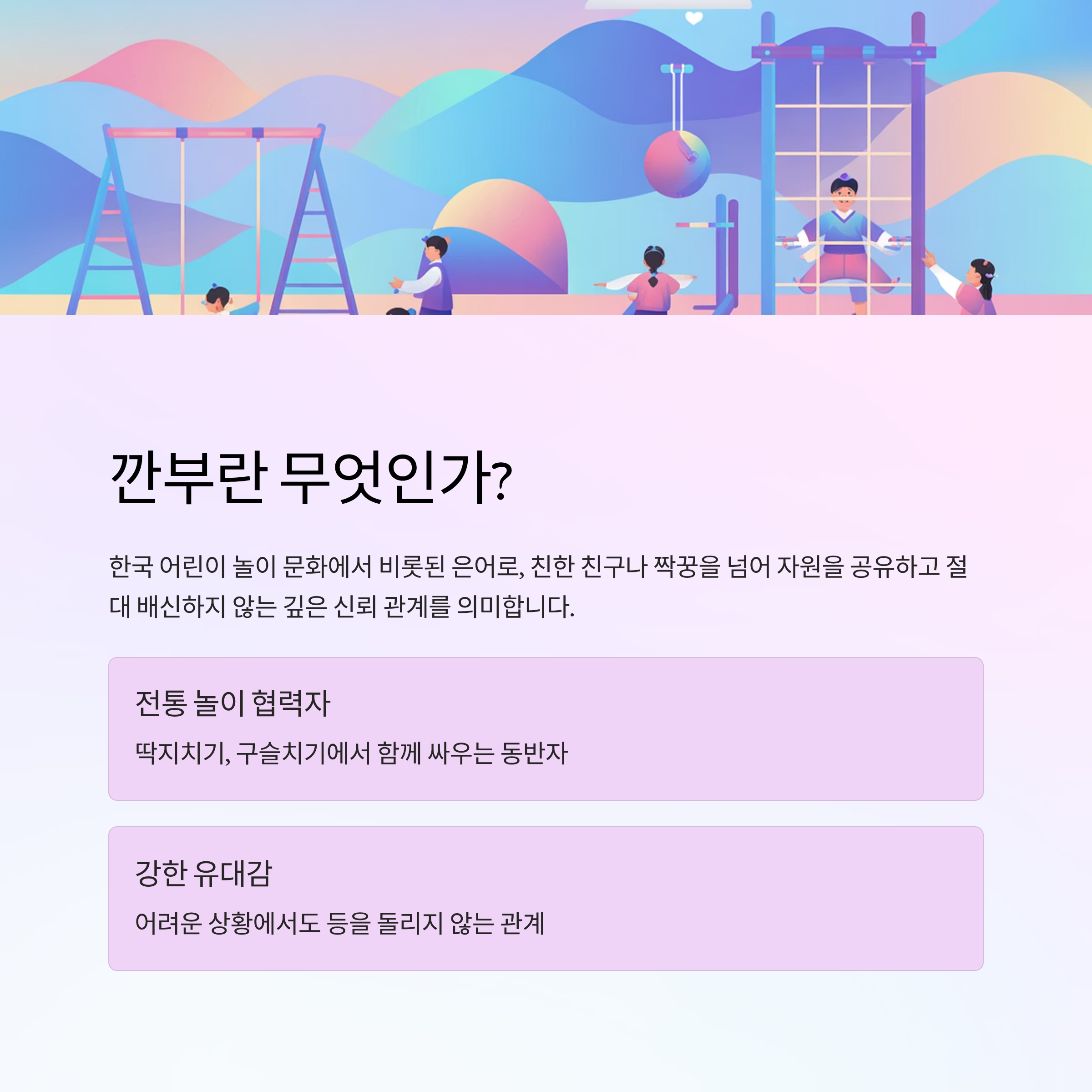 ‘깐부’는 단순한 친구를 넘어, 믿고 의지할 수 있는 진짜 동반자를 의미하는 단어입니다. 전통 놀이에서 유래된 이 말은, 현대에 와서도 깊은 인간 관계의 상징으로 계속 사용되고 있습니다.