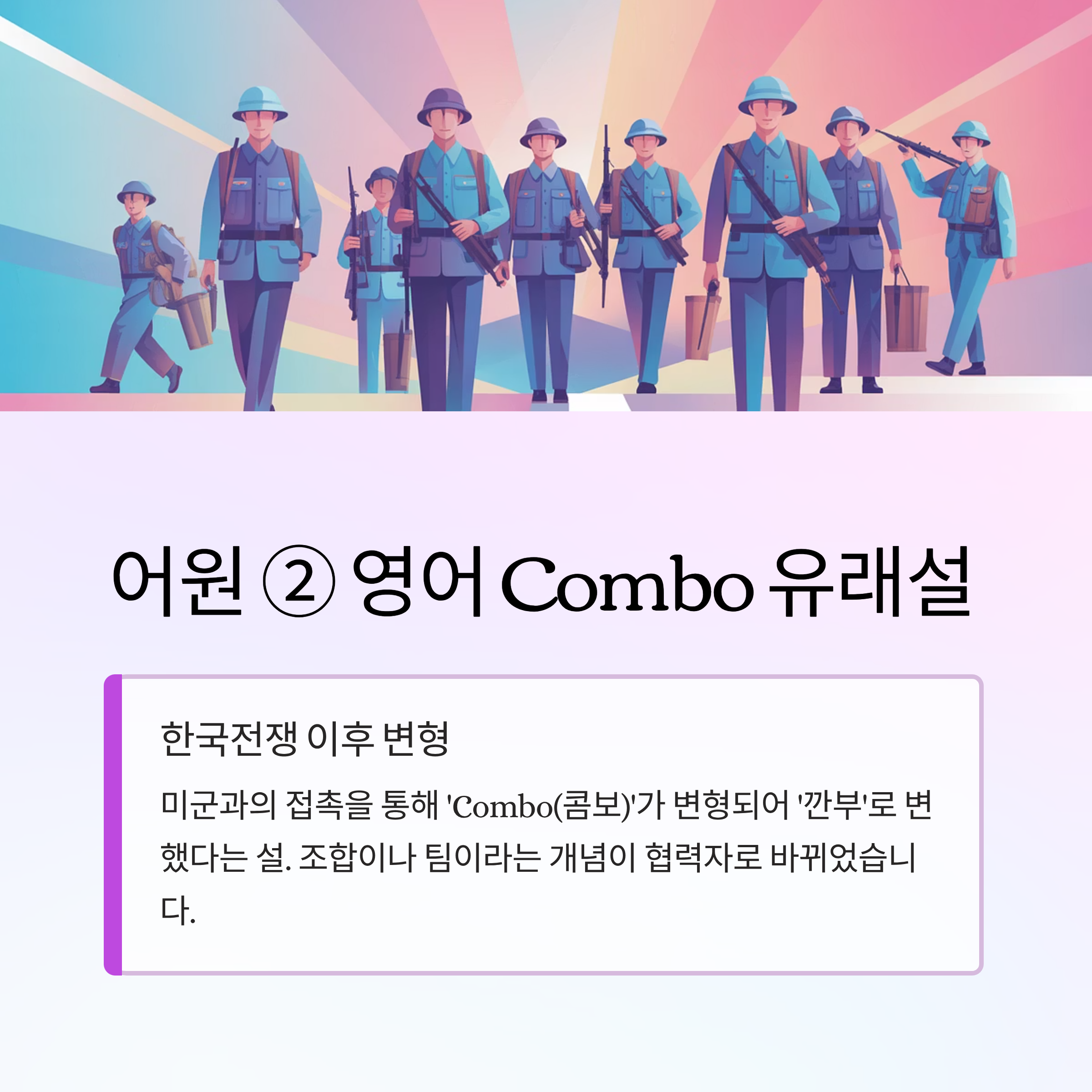 일각에서는 한국전쟁 이후 주둔한 미군과의 접촉을 통해 영어 단어 ‘Combo(콤보)’가 변형되어 ‘깐부’로 변했다는 설도 제기됩니다. 콤보(조합, 팀)라는 개념이 ‘짝’ 혹은 ‘협력자’라는 의미로 바뀌었다는 것이죠.