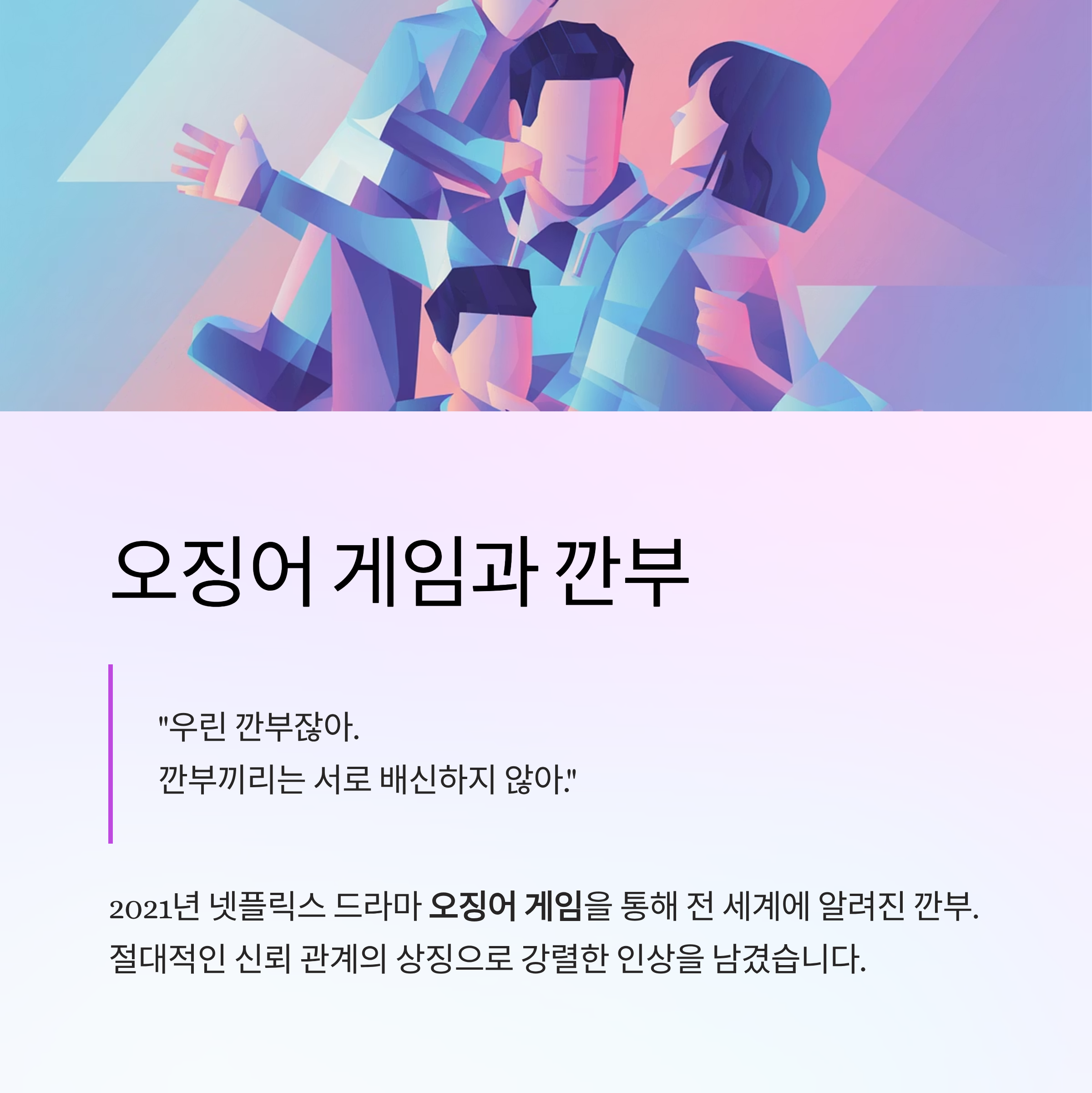 최근 몇 년 사이, ‘깐부’라는 단어가 대중문화 속에서 강하게 부각되며 많은 이들의 관심을 끌고 있습니다. 단순한 친구를 지칭하는 말을 넘어서 깊은 신뢰와 협력 관계를 의미하는 단어로서, 특히 **넷플릭스 드라마 <오징어 게임>**을 계기로 전 세계적으로도 그 의미가 알려졌죠.