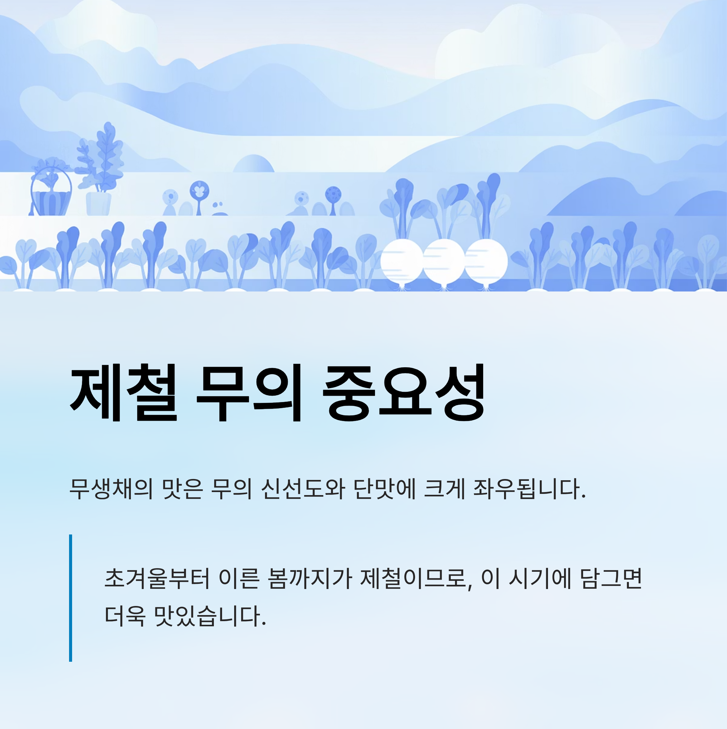 무는 초겨울부터 이른 봄까지가 제철이므로, 이 시기에 담그면 더욱 맛있습니다.