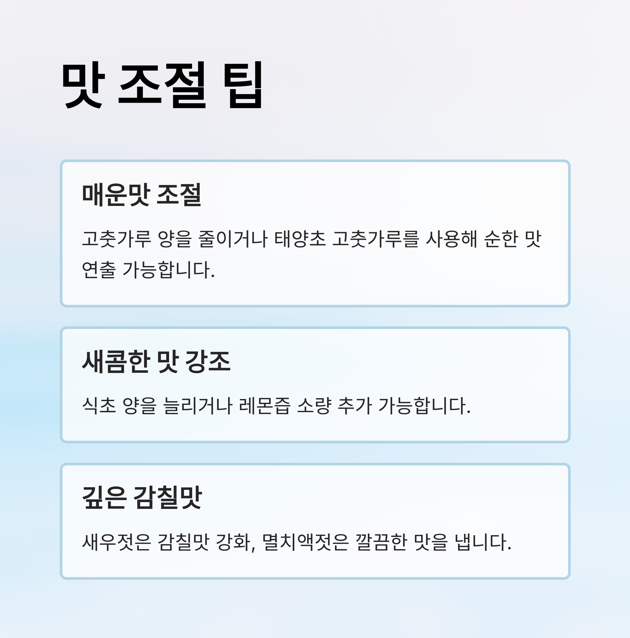 - 새콤한 맛 강조: 식초 양을 늘리거나 레몬즙 소량 추가 가능