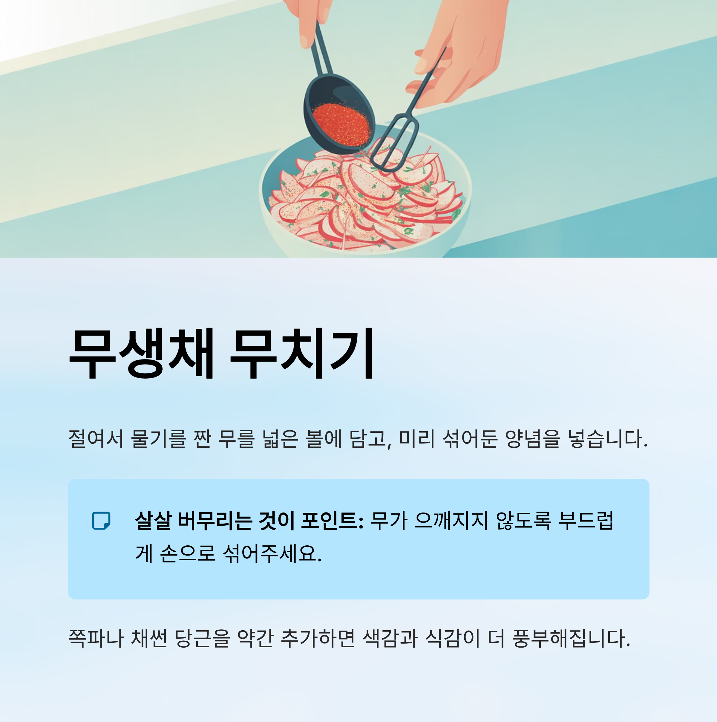 - 살살 버무리는 것이 포인트: 무가 으깨지지 않도록 부드럽게 손으로 섞어주세요.