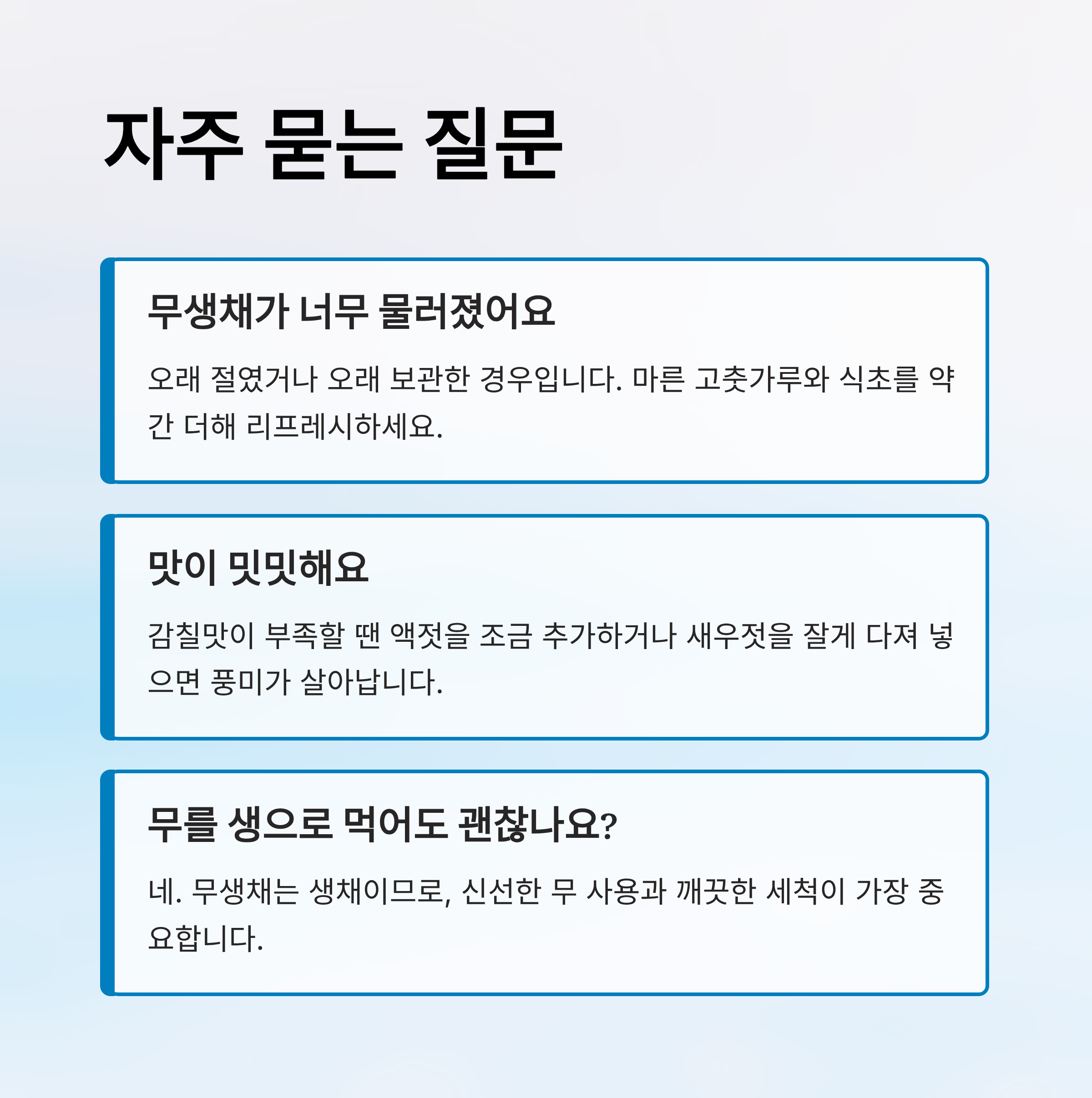 - 시간이 지나면 무에서 수분이 나오며 물러질 수 있으니, 즉석 반찬 개념으로 빠르게 섭취하는 것이 좋습니다.