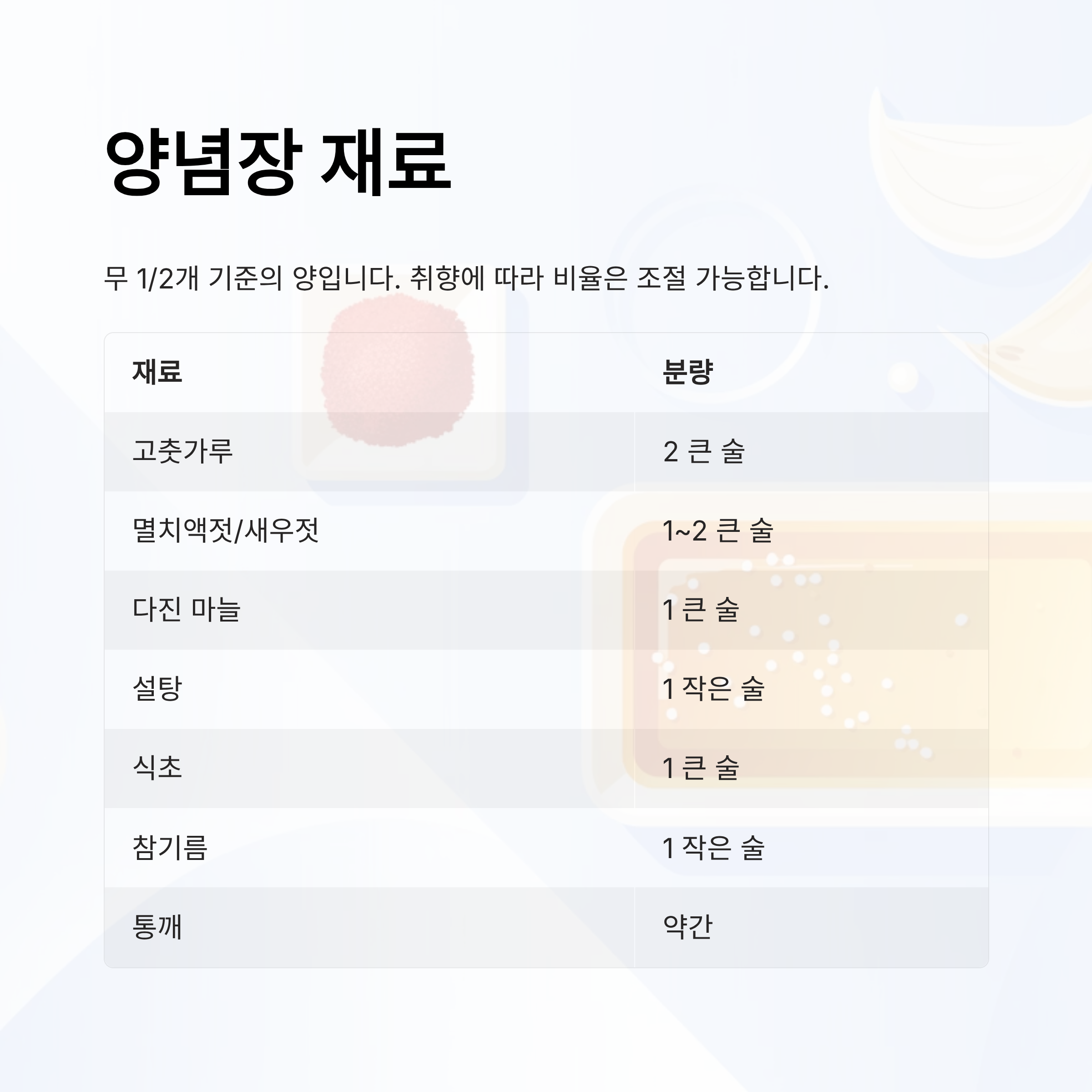 아래 재료는 무 1/2개 기준의 양입니다. 취향에 따라 비율은 조절 가능합니다.