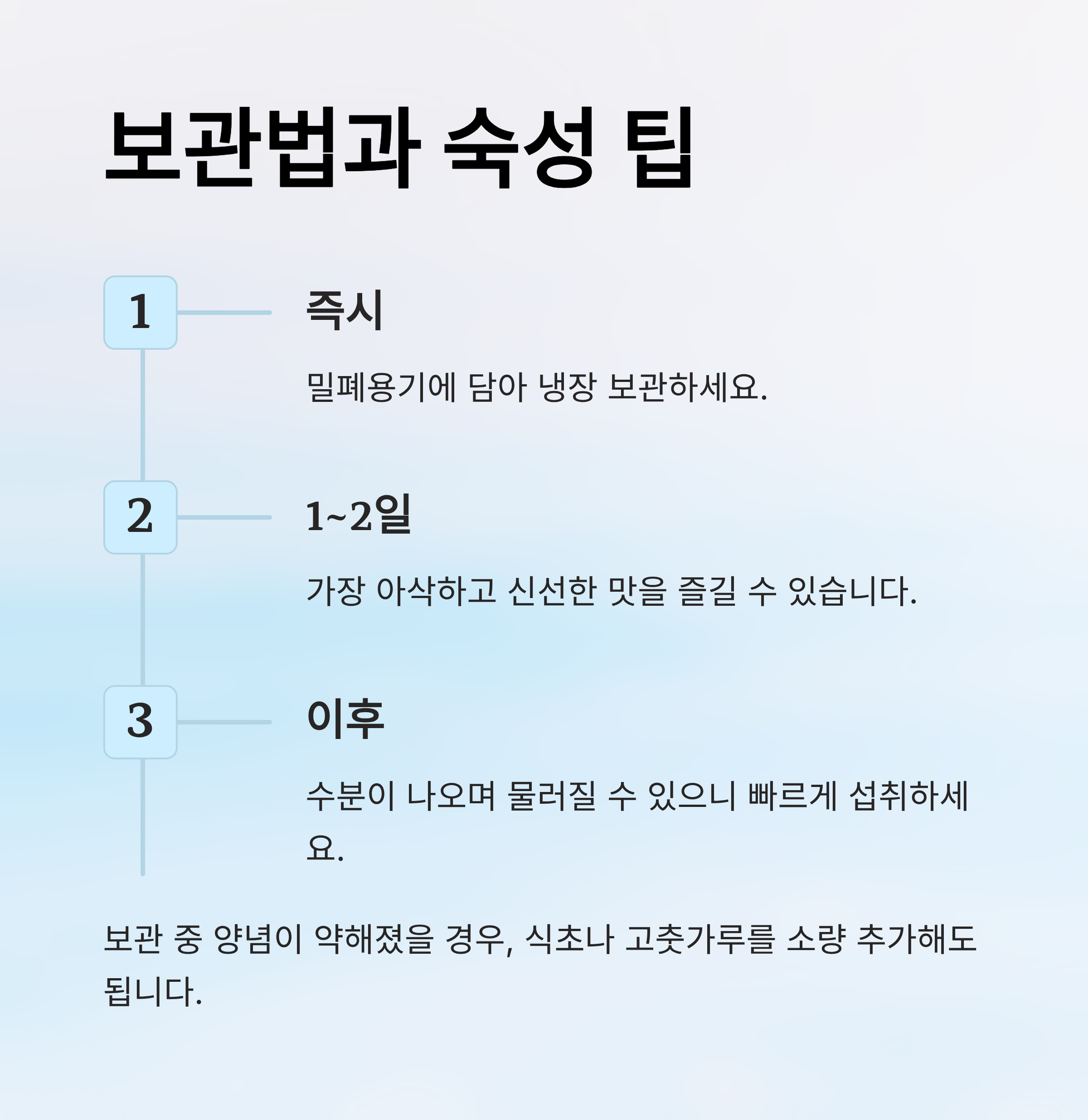 - 보관 중 양념이 약해졌을 경우, 식초나 고춧가루를 소량 추가해도 됩니다.