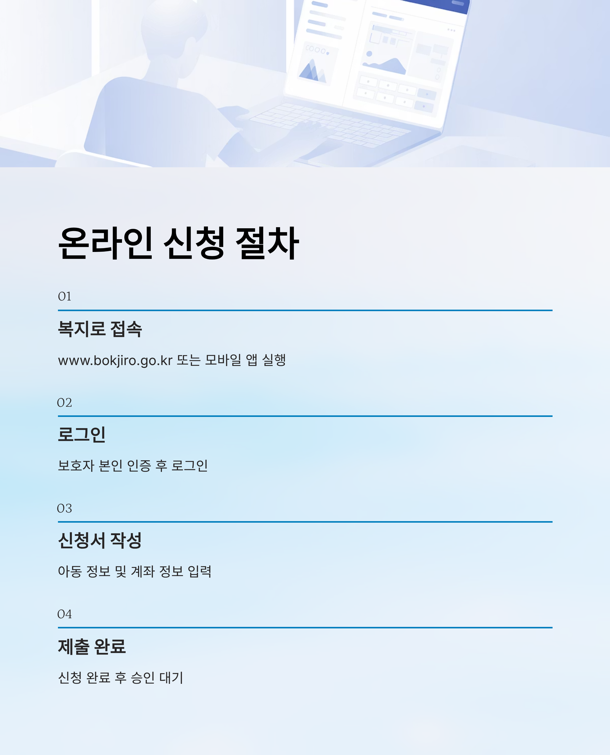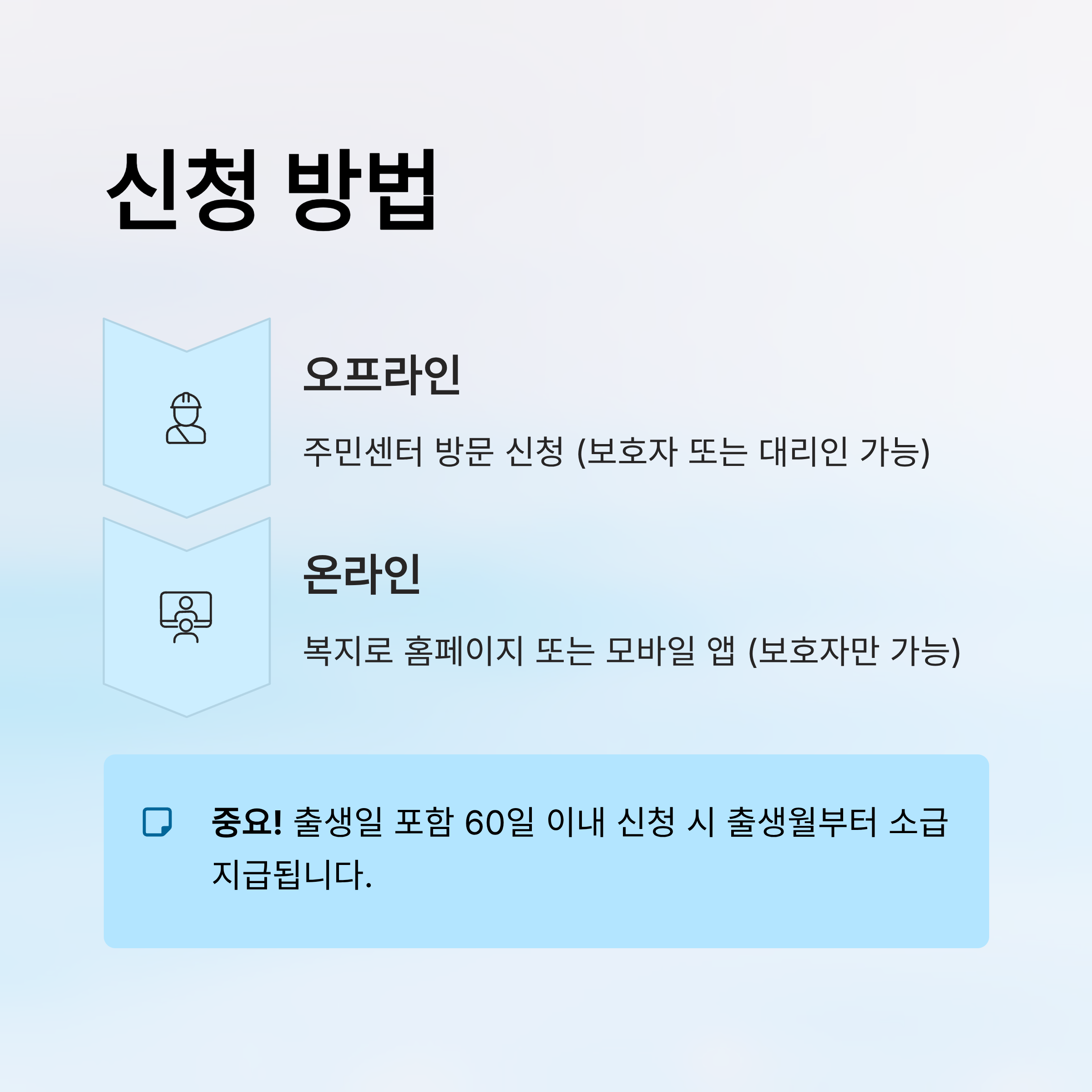 아동수당은 신청 후부터 지급되므로, 반드시 보호자가 아래 방법 중 하나로 신청해야 합니다.