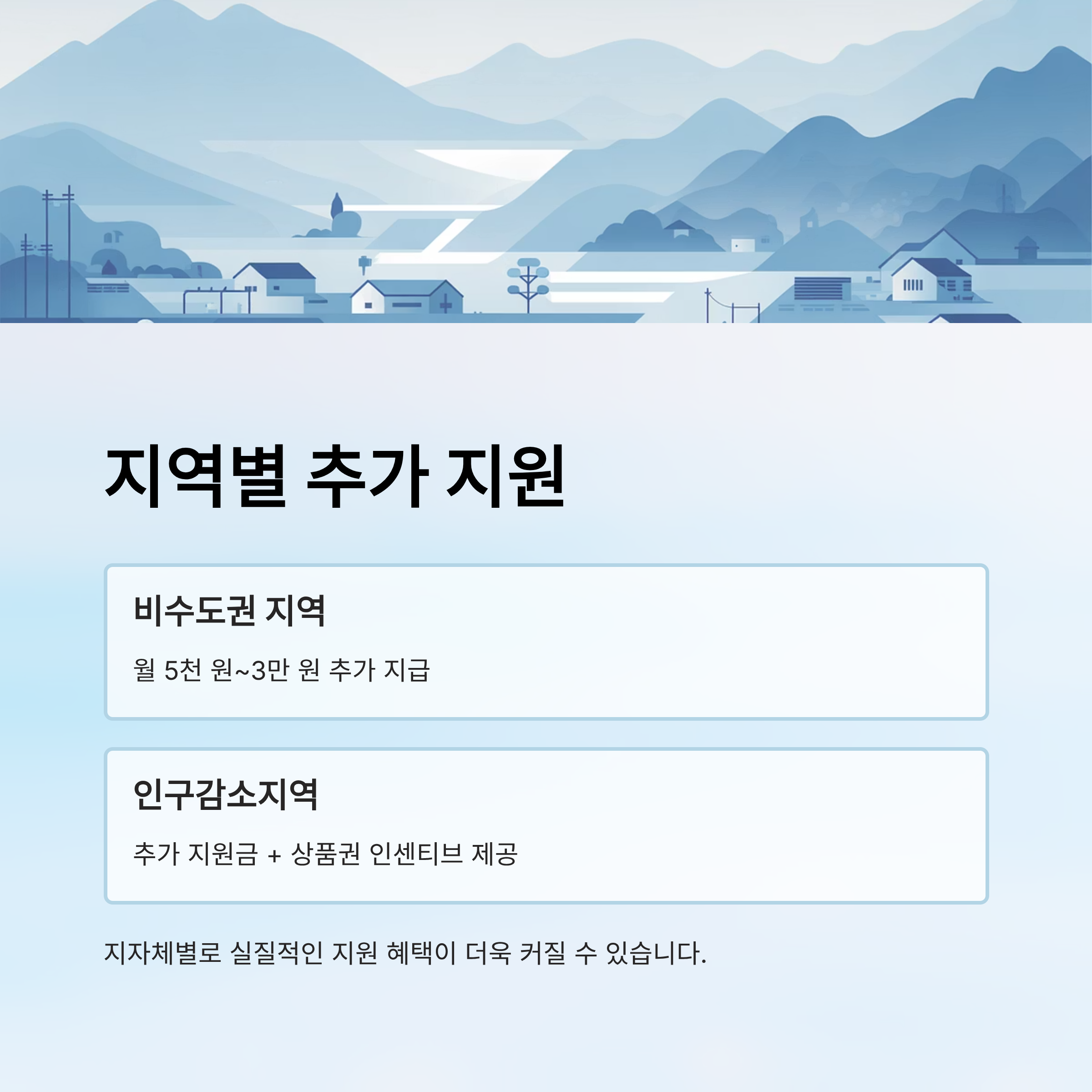 수도권 외 비수도권 및 인구감소지역 아동에게는 월 5천 원~3만 원의 추가 지급이 이뤄집니다. 일부 지자체는 상품권 선택 시 추가 인센티브도 제공하고 있어, 실질적인 지원 혜택이 더 커질 수 있습니다.