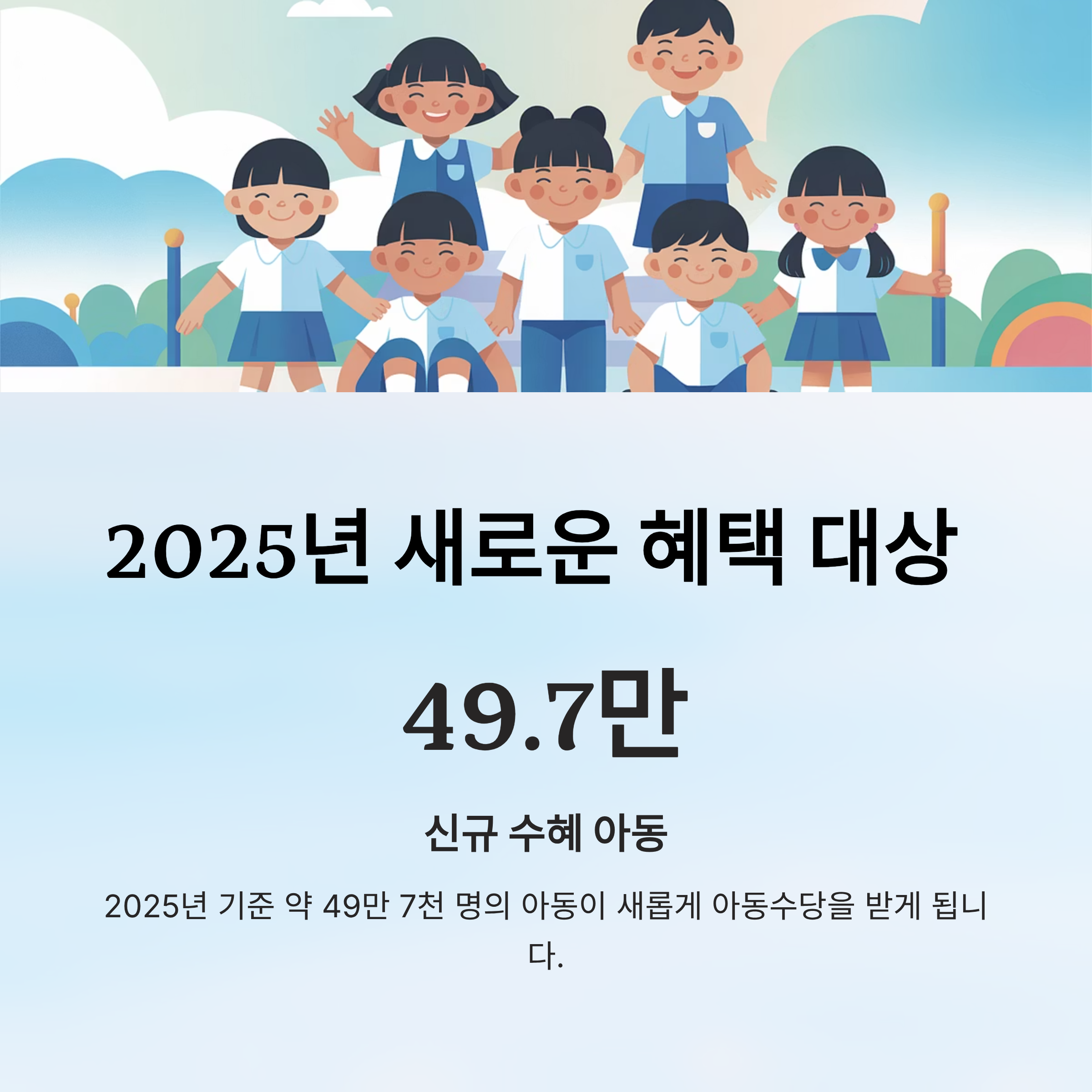 💡 이번 확대 정책으로만도 2025년 기준 약 49만 7천 명의 아동이 새롭게 혜택을 받을 수 있습니다.