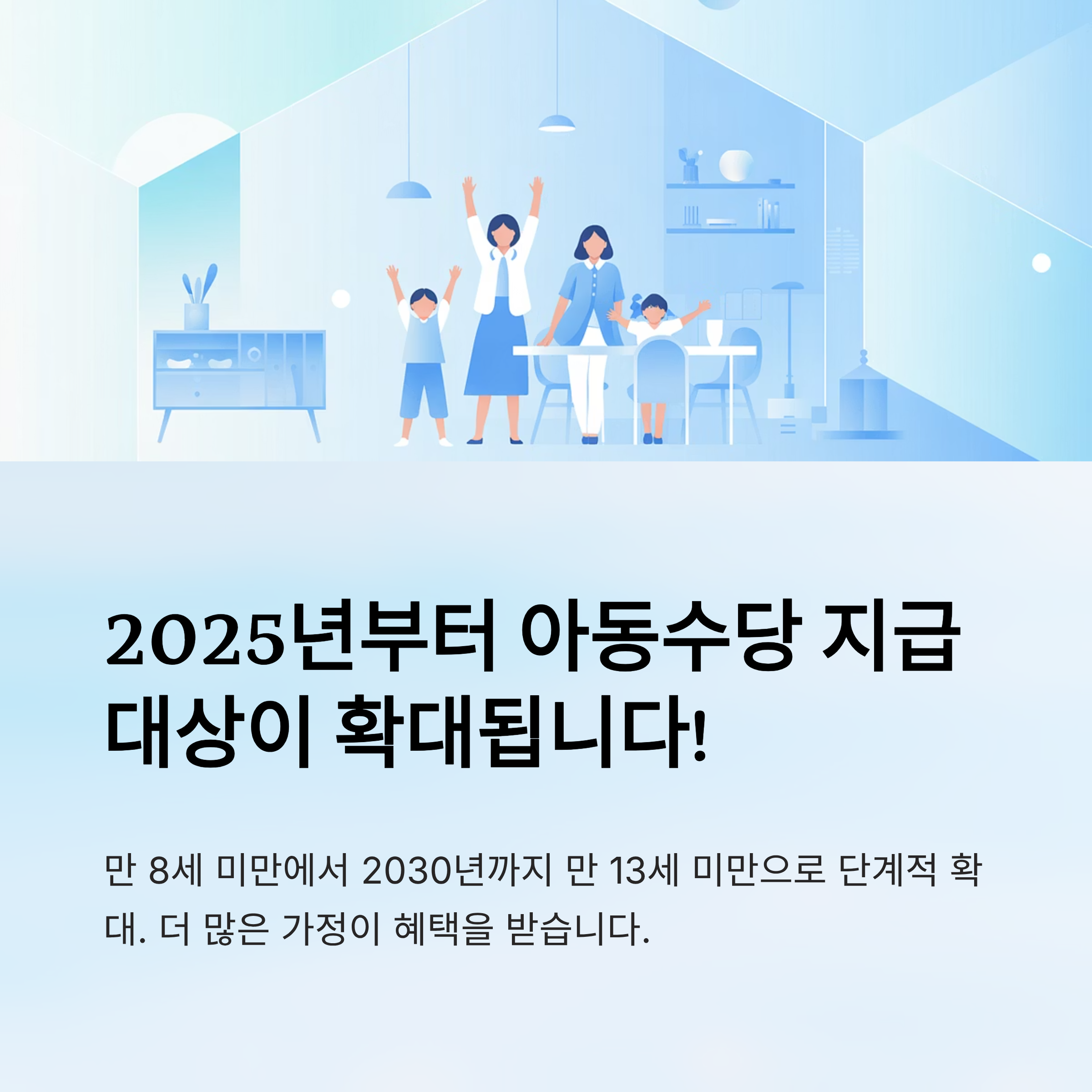 아동수당 지급 대상이 2030년까지 만 13세 미만으로 확대됨에 따라, 더 많은 가정이 실질적인 경제적 지원을 받을 수 있게 되었습니다.