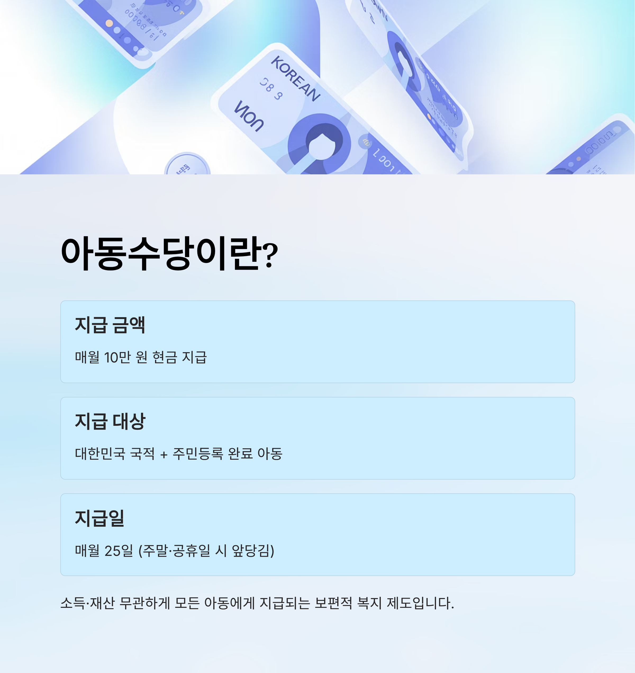 아동수당은 대한민국 국적을 가진 만 0세부터 일정 연령 미만 아동에게 매월 10만 원씩 현금으로 지급되는 복지 제도입니다. 소득이나 재산과 관계없이 지급되며, 부모의 양육 부담을 완화하고 아동의 기본적인 권리 보호를 목적으로 시행되고 있습니다.