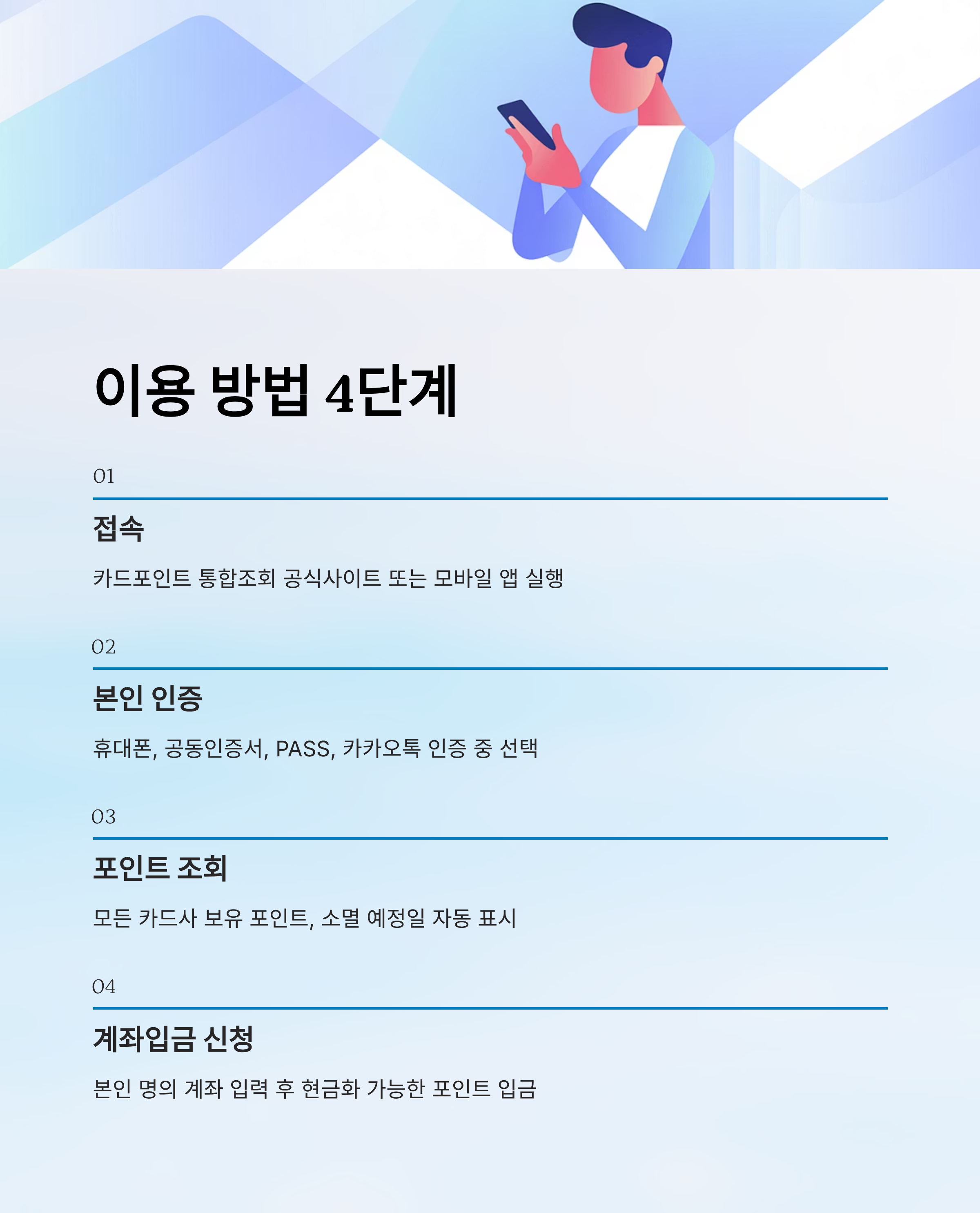 ‘카드포인트 통합조회 및 계좌입금 서비스’는 잠자고 있는 포인트를 현금으로 바꿔주는 가장 간단한 금융 서비스입니다.