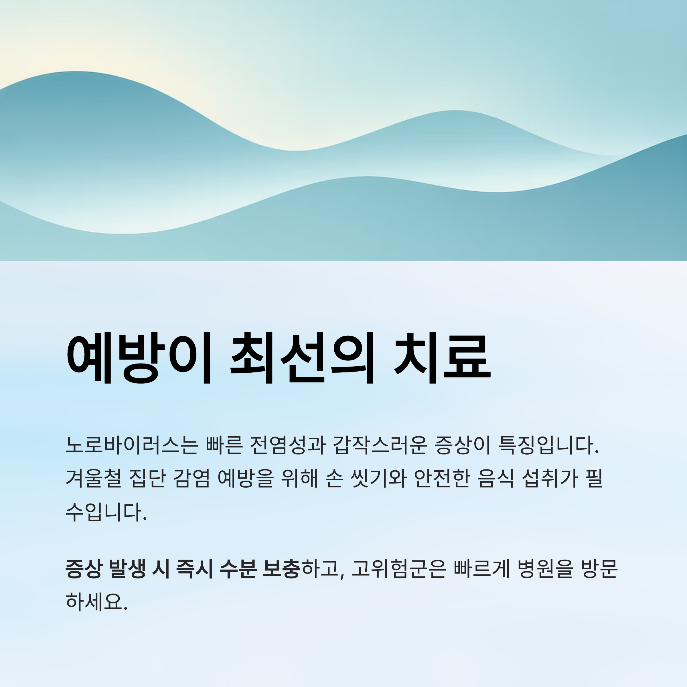 노로바이러스 장염은 빠른 전염성과 갑작스러운 증상 발현이 특징입니다. 특히 겨울철 집단 감염이 빈번하기 때문에 손 씻기, 안전한 음식 섭취 등 생활 속 위생 관리가 필수입니다. 증상이 나타났다면 즉시 수분 보충에 집중하고, 고위험군은 빠르게 병원을 방문해야 합니다.