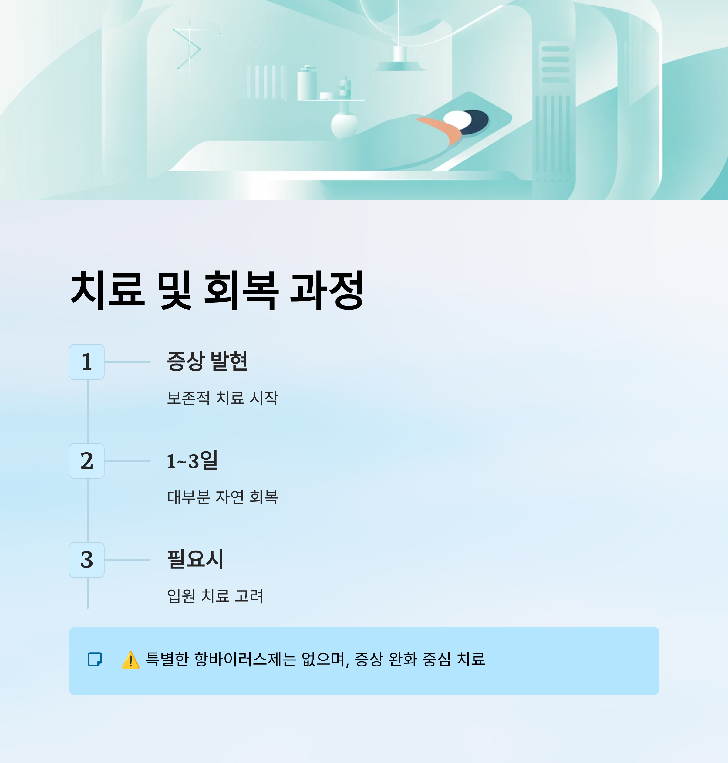- 특별한 치료제 없음: 항바이러스제 미존재, 증상 완화 중심의 보존적 치료
