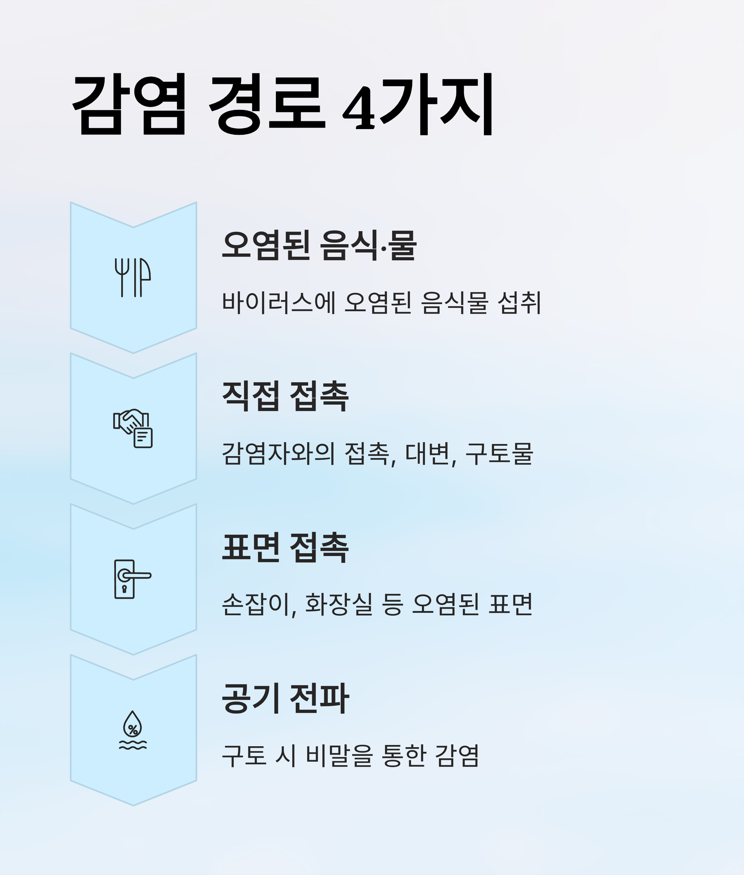 - 감염자와의 직접 접촉 (대변, 구토물, 악수 등)