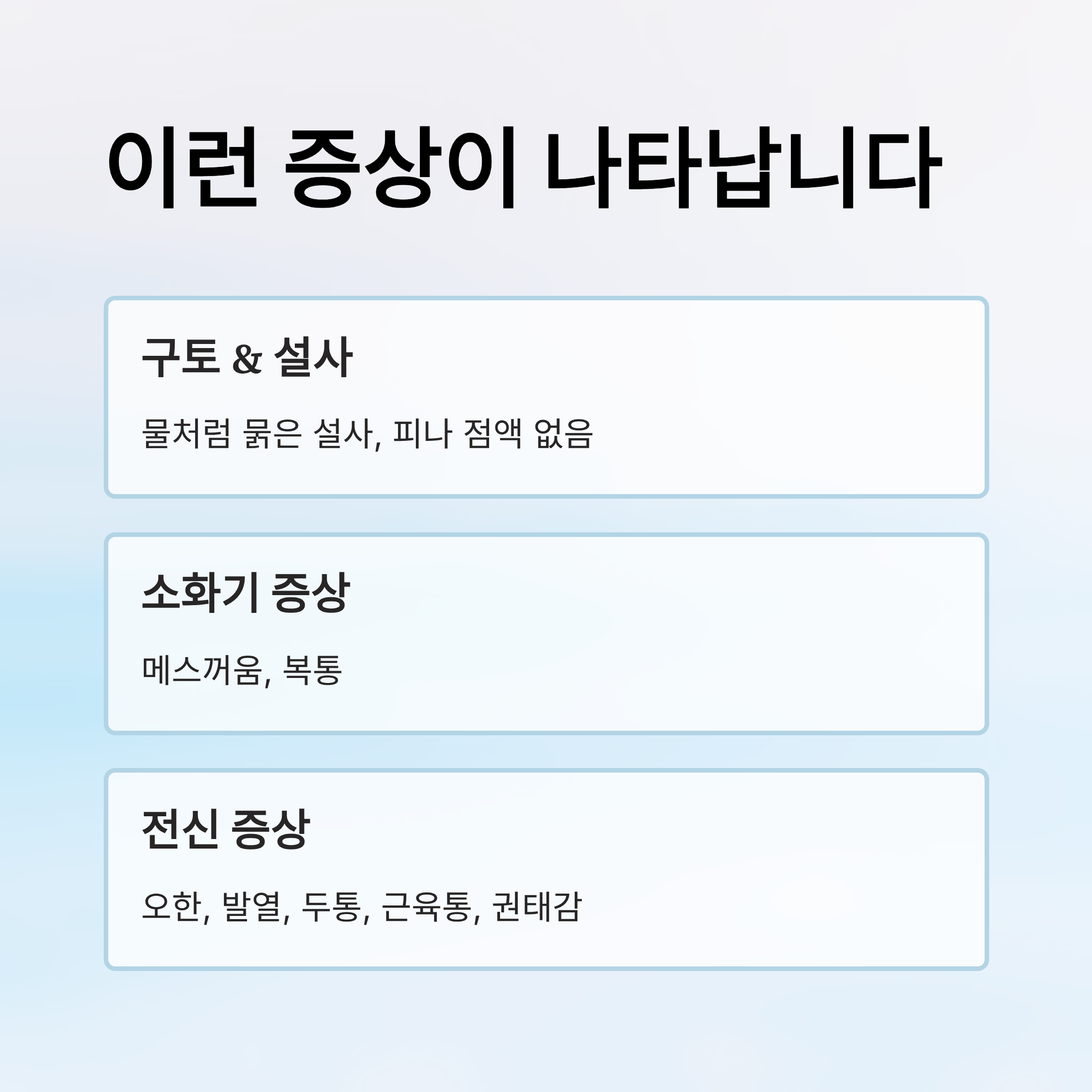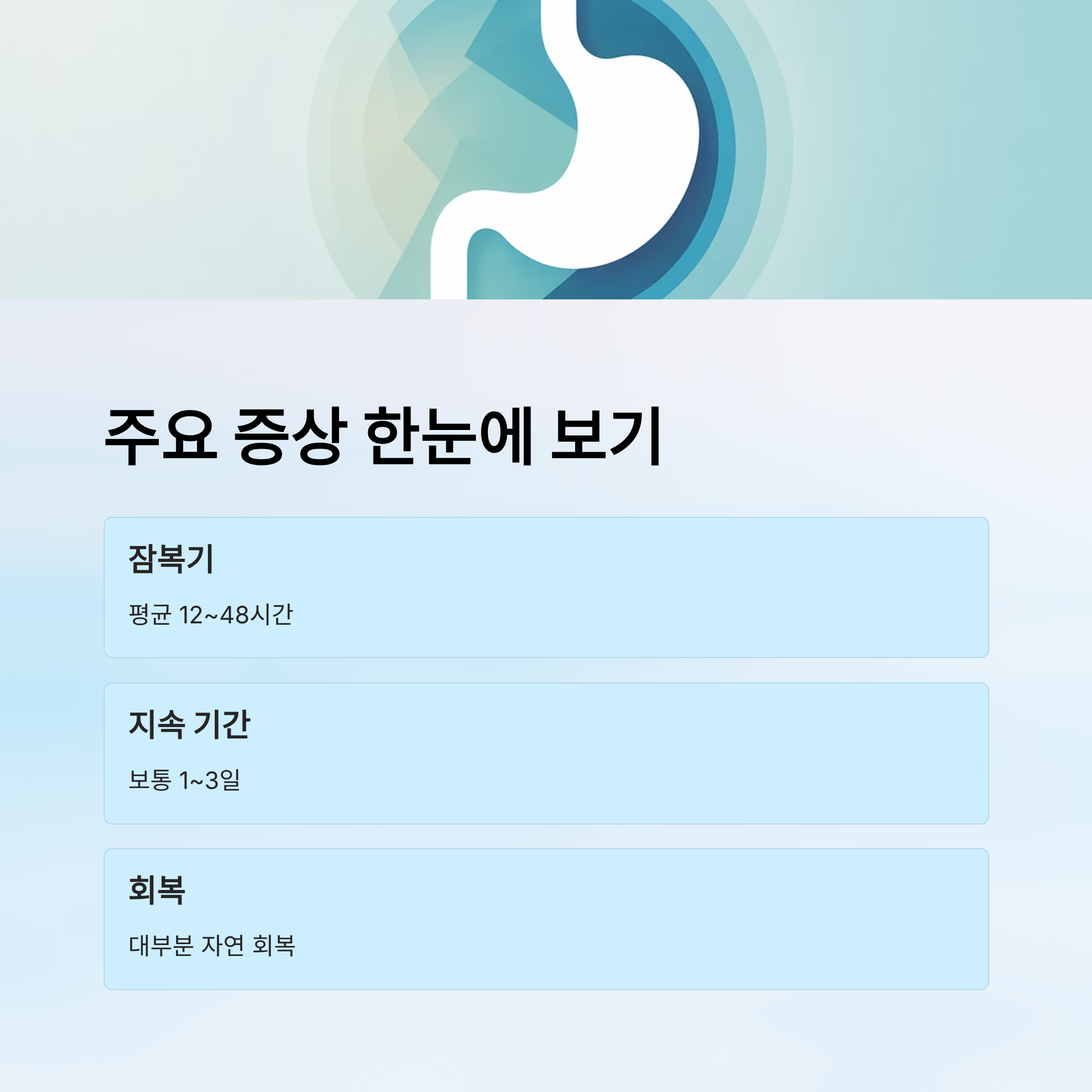 💡 TIP: 증상은 보통 1~3일 지속되며, 대부분 자연적으로 회복되지만 탈수 증상이 심하면 반드시 병원에 방문해야 합니다.