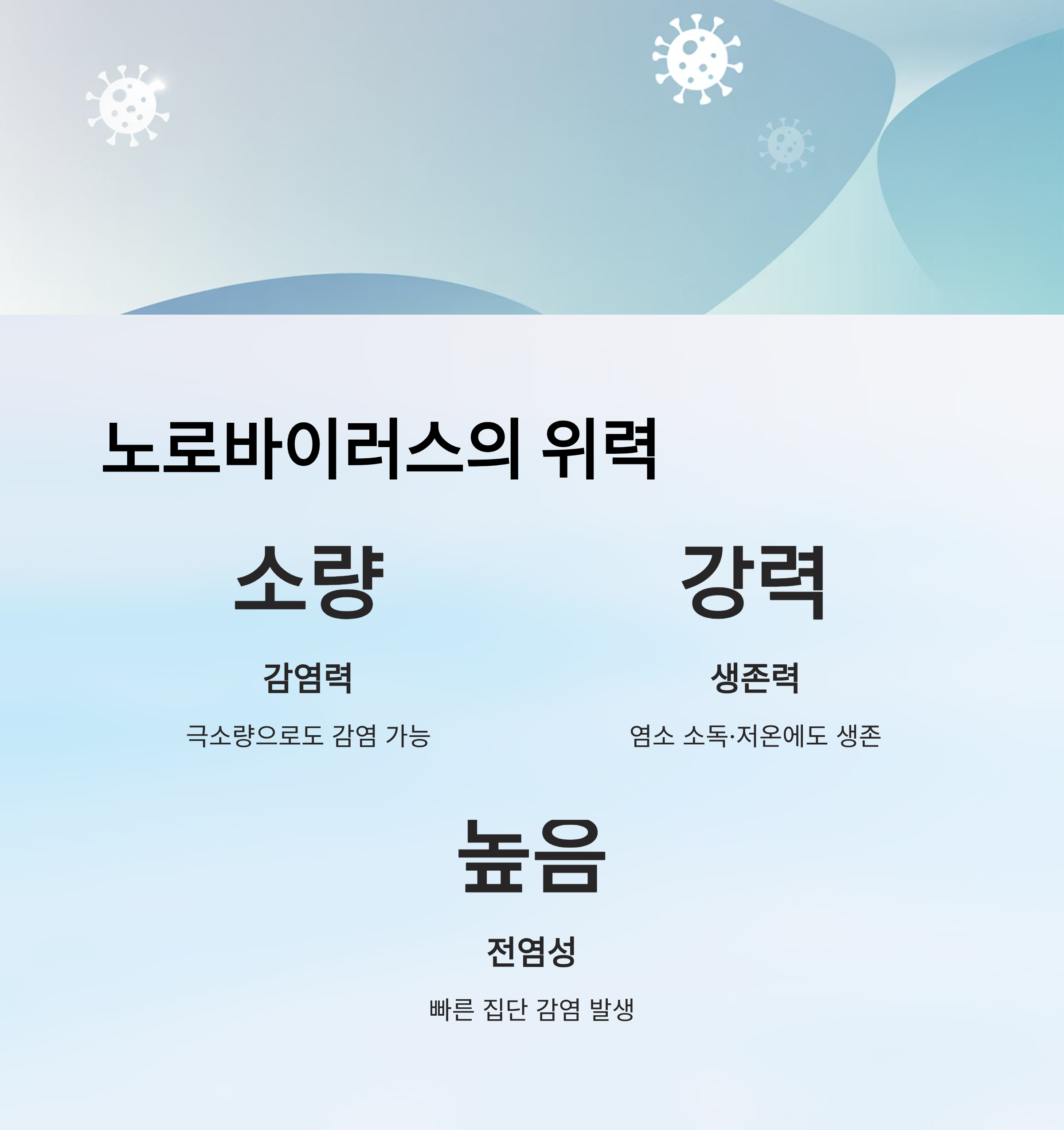 🚨 주의: 소량의 바이러스로도 감염되며, 염소 소독이나 저온에도 생존 가능할 만큼 강력한 전염성을 가졌습니다.
