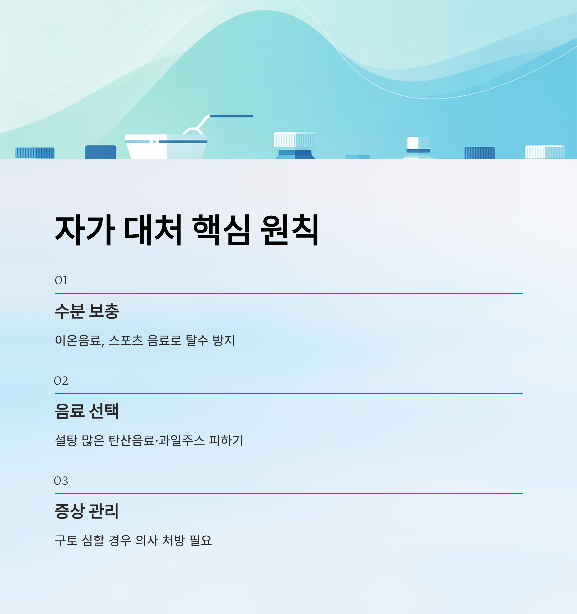 - 수분 및 전해질 보충: 이온음료, 스포츠 음료 등을 활용해 탈수 방지