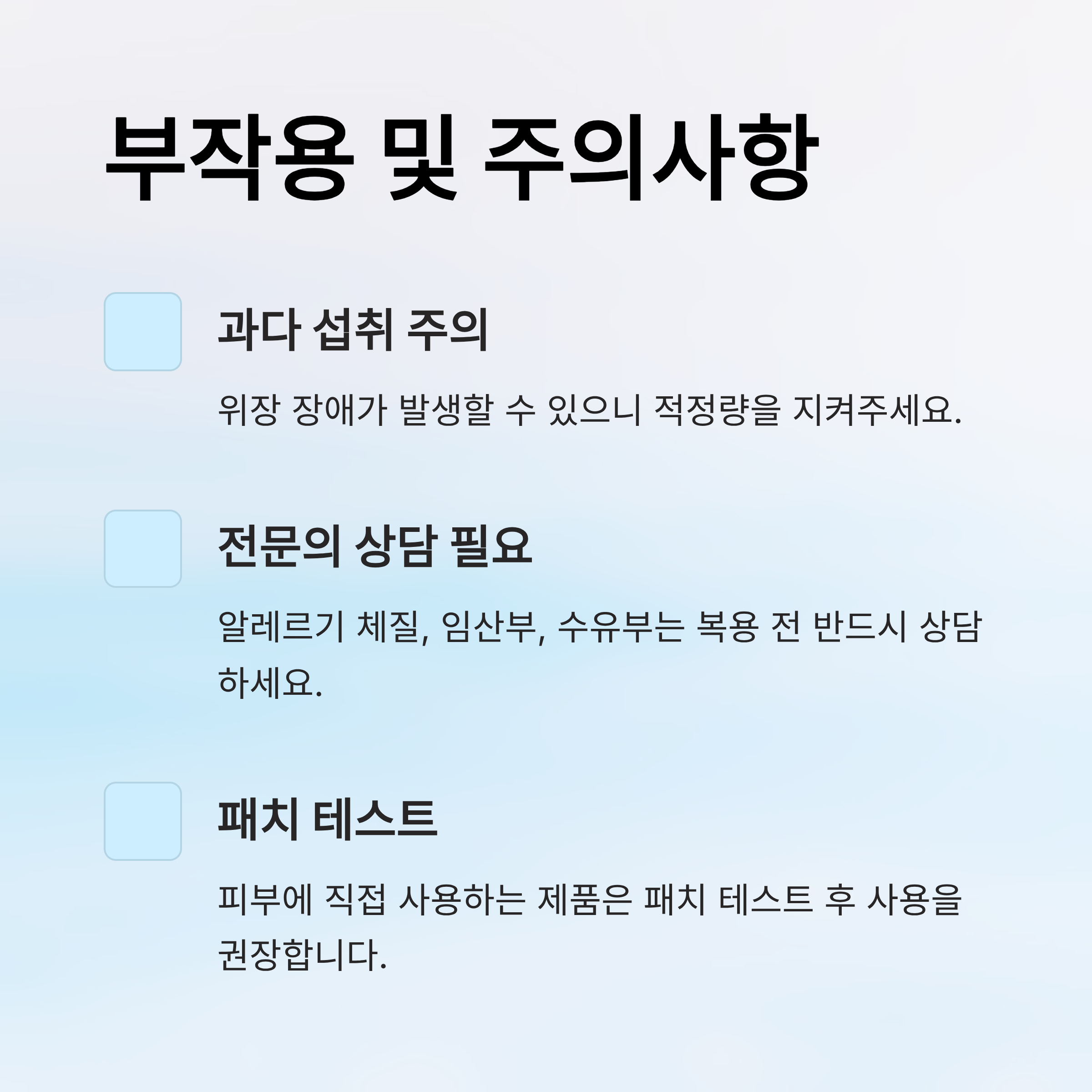 - 알레르기 체질, 임산부, 수유부는 복용 전 전문의 상담 필요