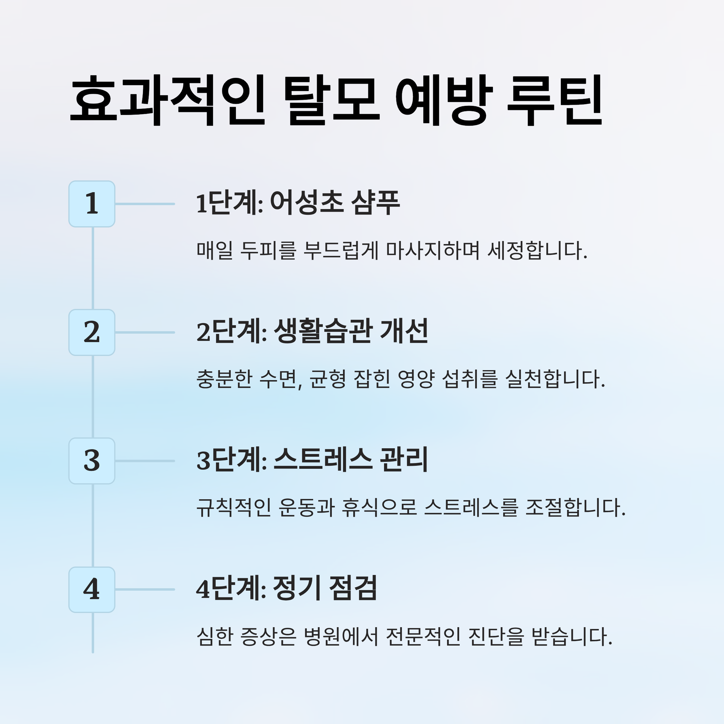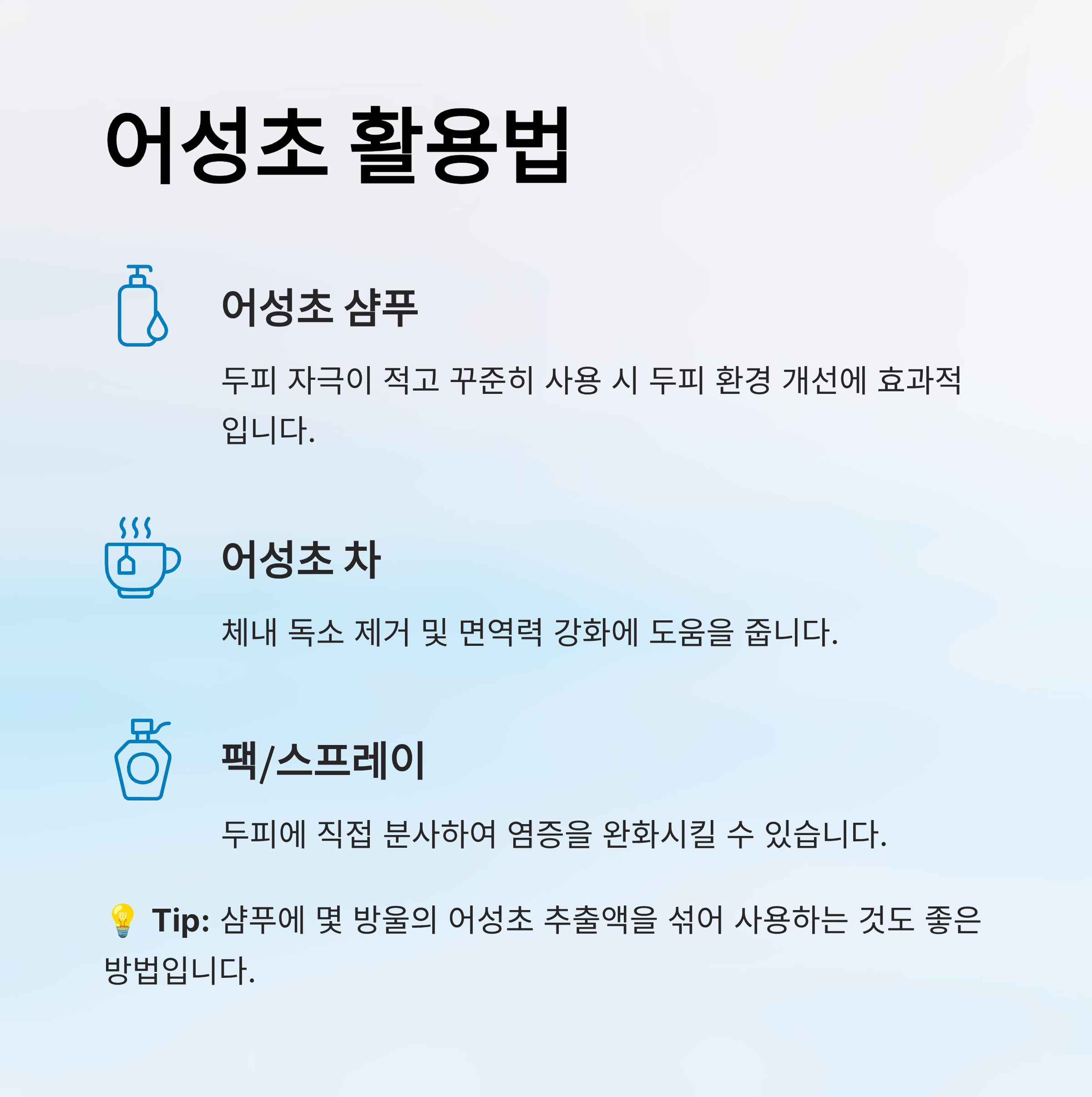 💡 Tip: 샴푸에 몇 방울의 어성초 추출액을 섞어 사용하는 것도 방법입니다.