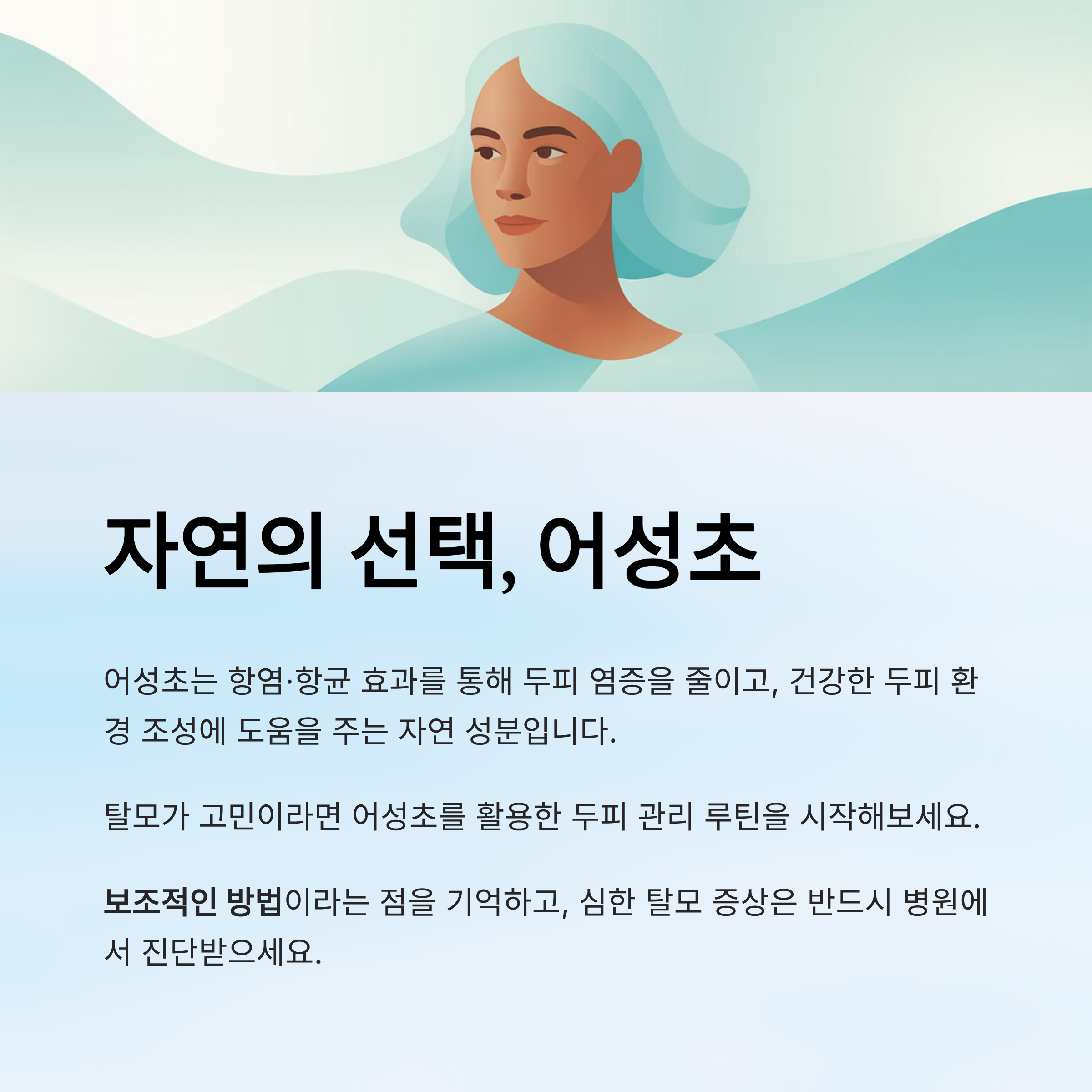 어성초는 항염·항균 효과를 통해 두피 염증을 줄이고, 건강한 두피 환경 조성에 도움을 줄 수 있는 자연 성분입니다. 탈모가 고민이라면 어성초를 활용한 두피 관리 루틴을 시작해보세요. 단, 치료 목적이 아닌 보조적인 방법이라는 점을 기억하고, 심한 탈모 증상은 반드시 병원에서 진단받는 것이 좋습니다.