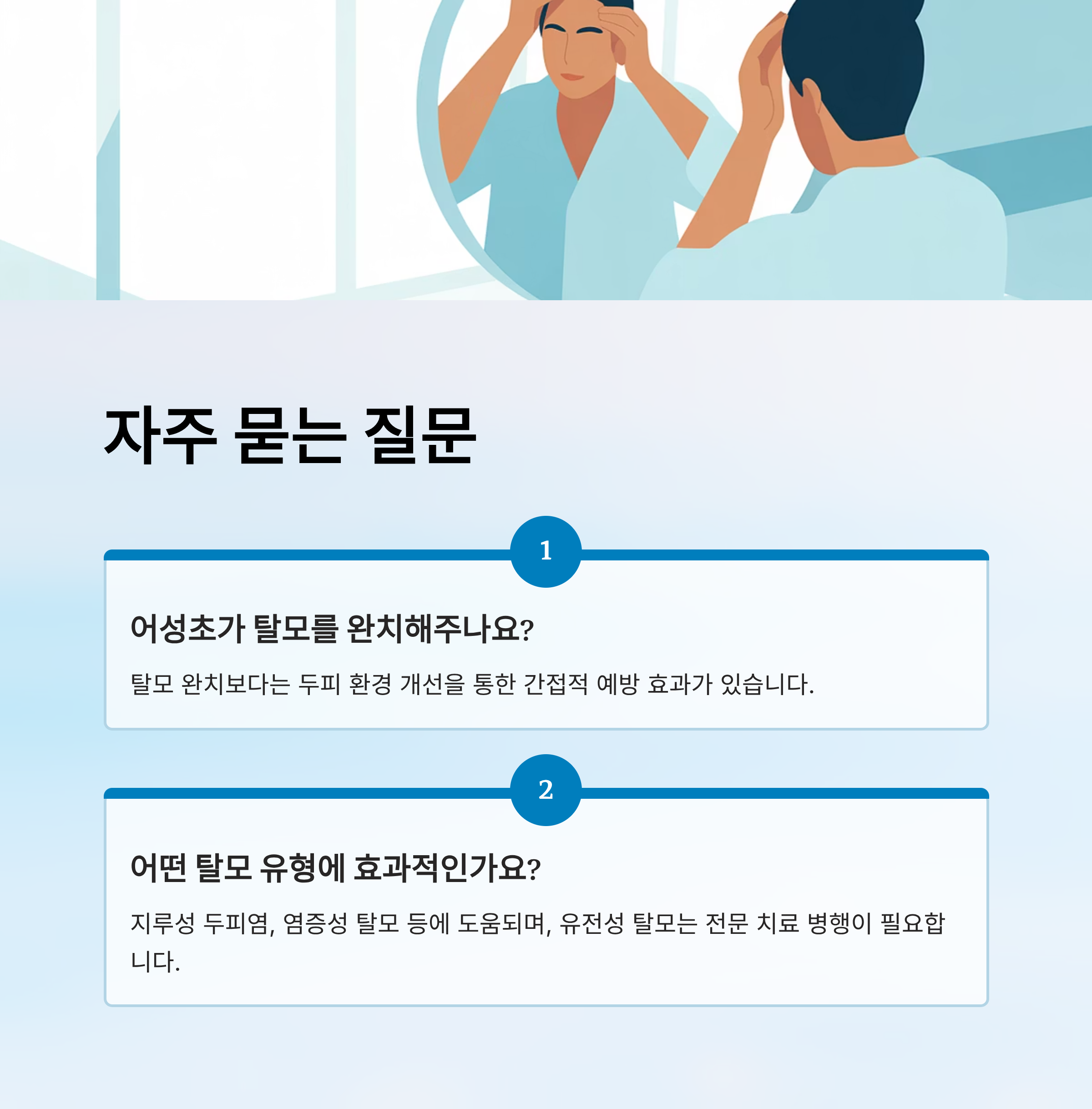 A1. 탈모 완치보다는 두피 환경 개선을 통한 간접적 예방 효과가 있습니다.