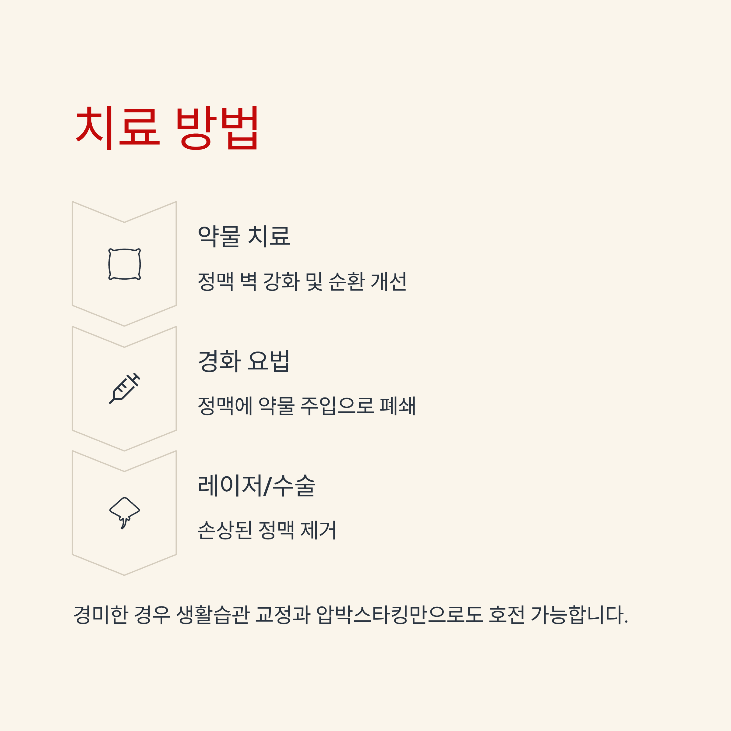 경미한 경우 생활습관 교정과 압박스타킹만으로도 호전될 수 있지만, 증상이 심한 경우 다음과 같은 치료법이 병행됩니다.