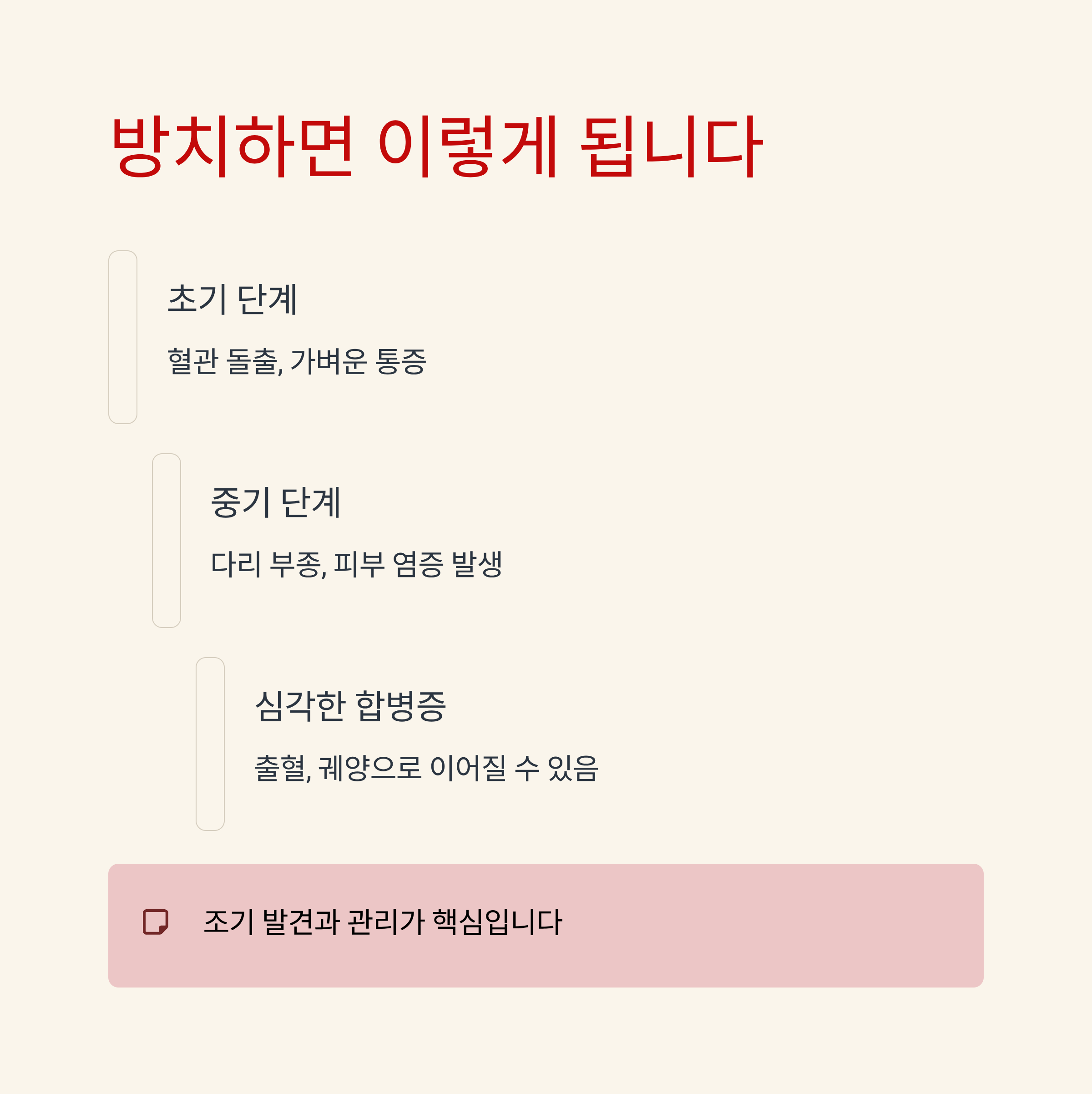 - 심한 경우 다리 부종, 피부 염증, 출혈, 궤양 발생