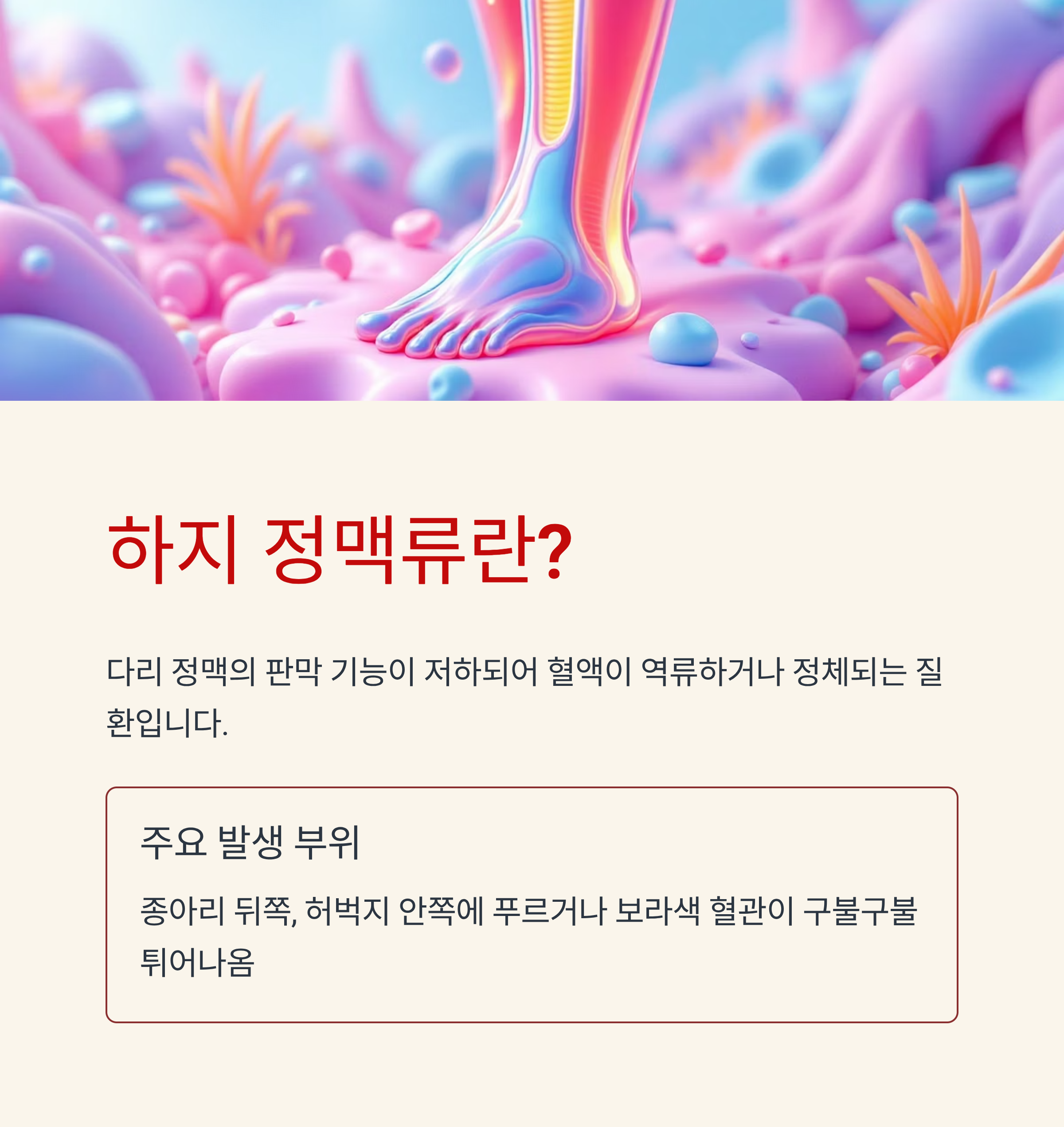 하지 정맥류는 단순한 미용 문제가 아닌, 다리 건강을 위협하는 만성 질환입니다. 특히 장시간 서 있거나 앉아있는 생활을 반복하는 중장년층에게서 흔히 발생하며, 방치할 경우 통증, 궤양, 출혈 등 심각한 합병증으로 이어질 수 있습니다.