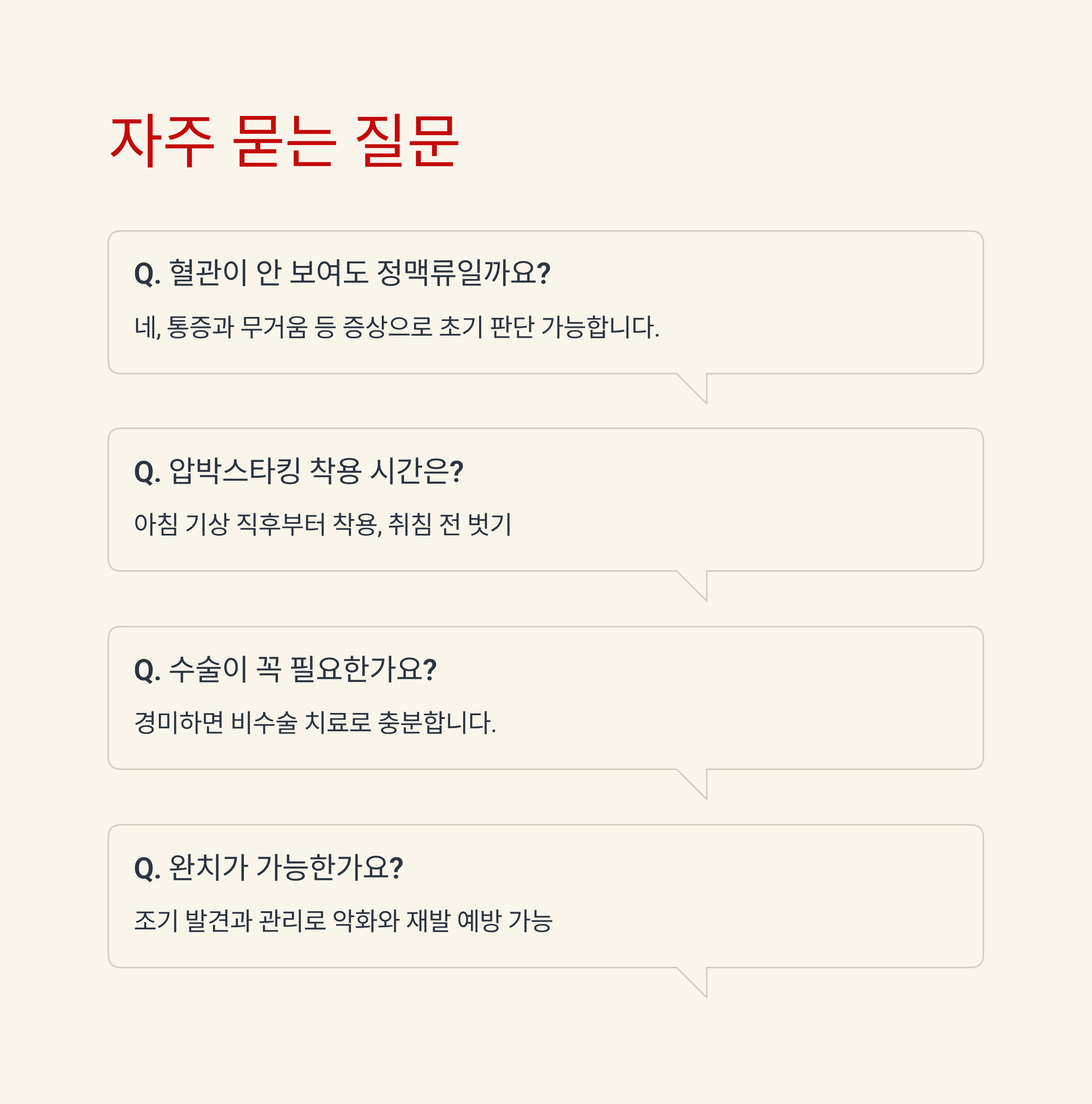A4. 손상된 정맥은 복원되지 않지만, 조기 발견과 꾸준한 관리로 증상 악화와 재발을 예방할 수 있습니다.