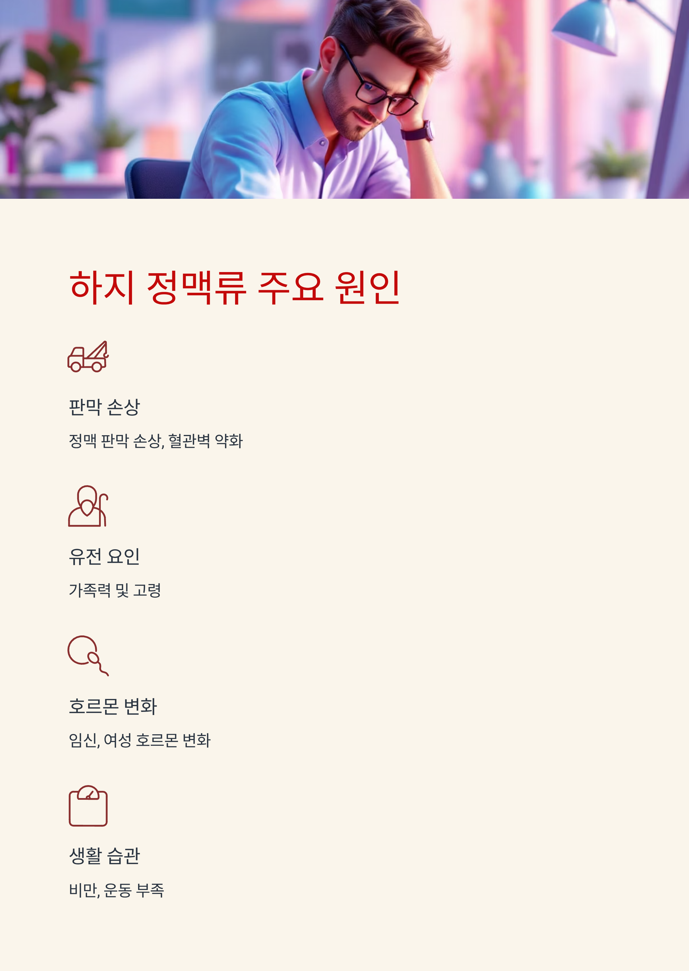 하지 정맥류는 다양한 생활습관과 신체 조건에 의해 유발됩니다.