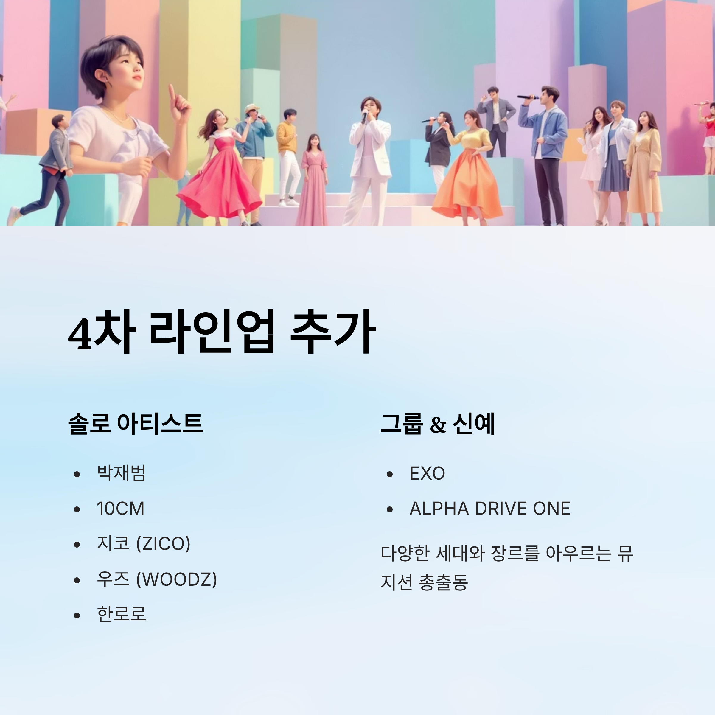- 박재범, 10CM, 지코(ZICO), EXO, 우즈(WOODZ), 한로로, ALPHA DRIVE ONE 등