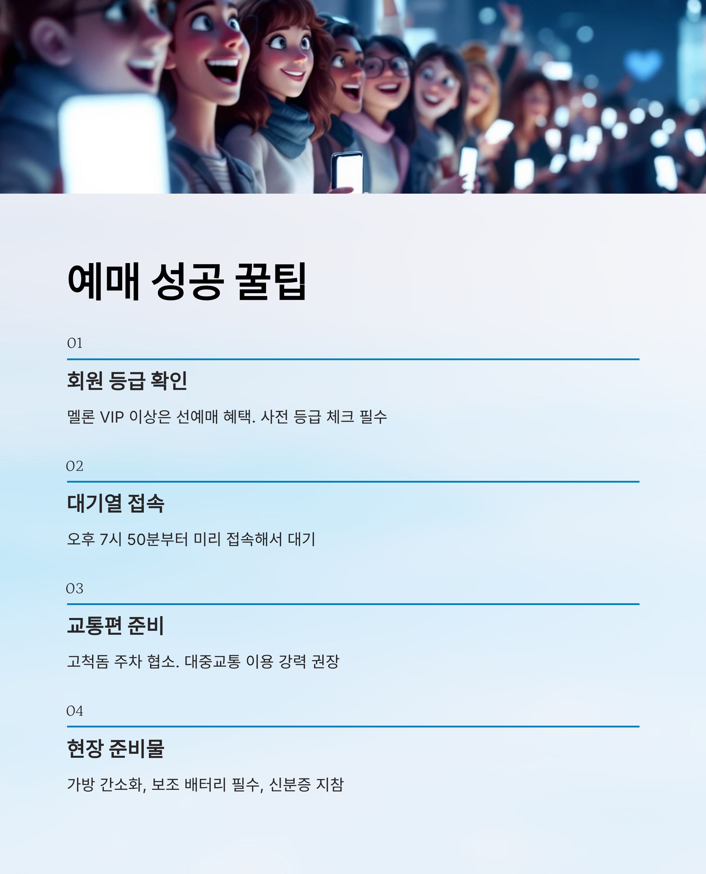 - 예매 전 회원 등급 확인: 멜론 VIP 등급 이상은 선예매 혜택이 있으니 사전 등급 확인 필수