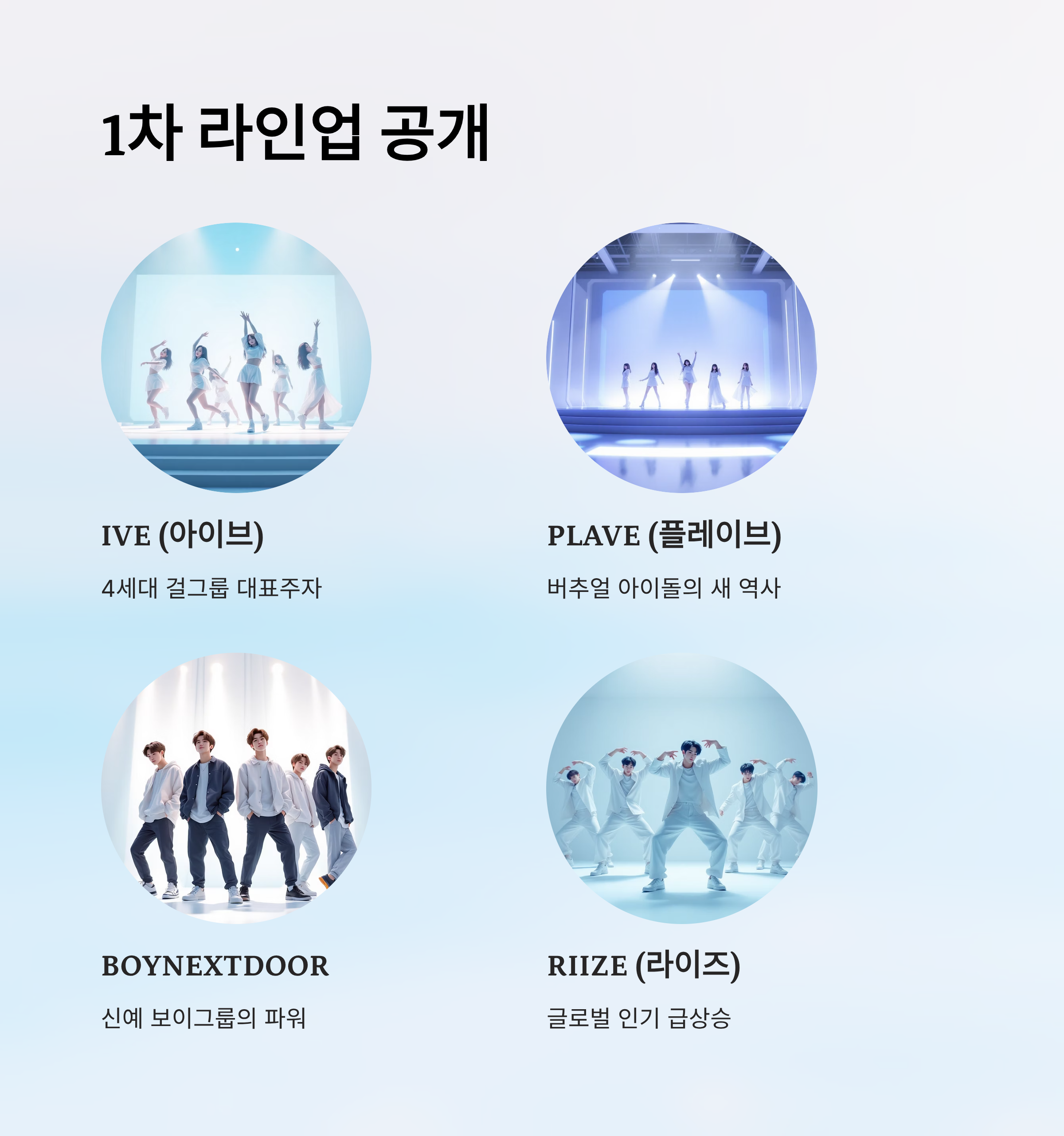 - IVE(아이브), PLAVE(플레이브), BOYNEXTDOOR(보이넥스트도어), RIIZE(라이즈)
