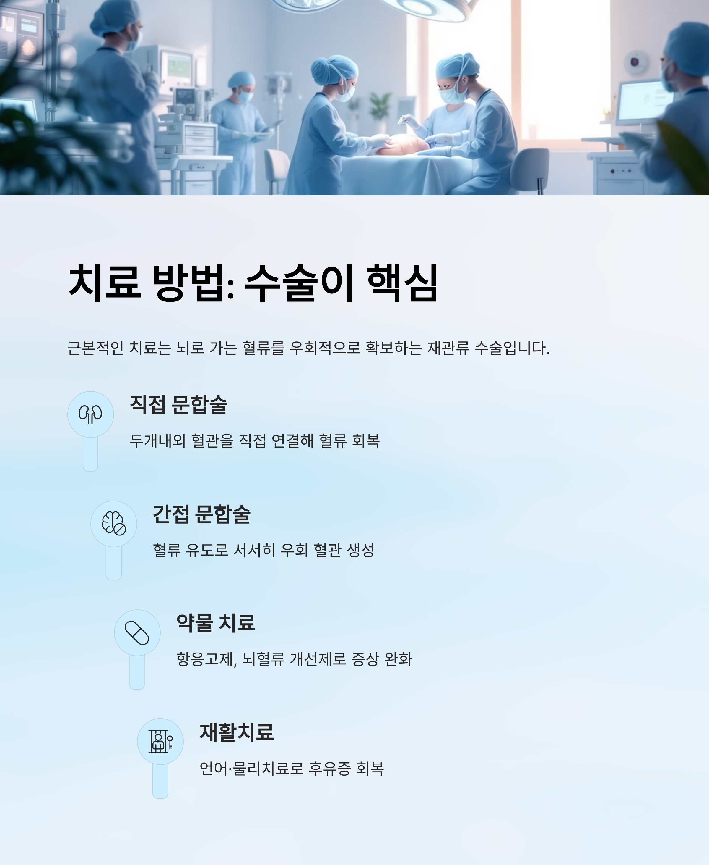 - 근본 치료는 아니며, 항응고제, 뇌혈류 개선제 등을 사용