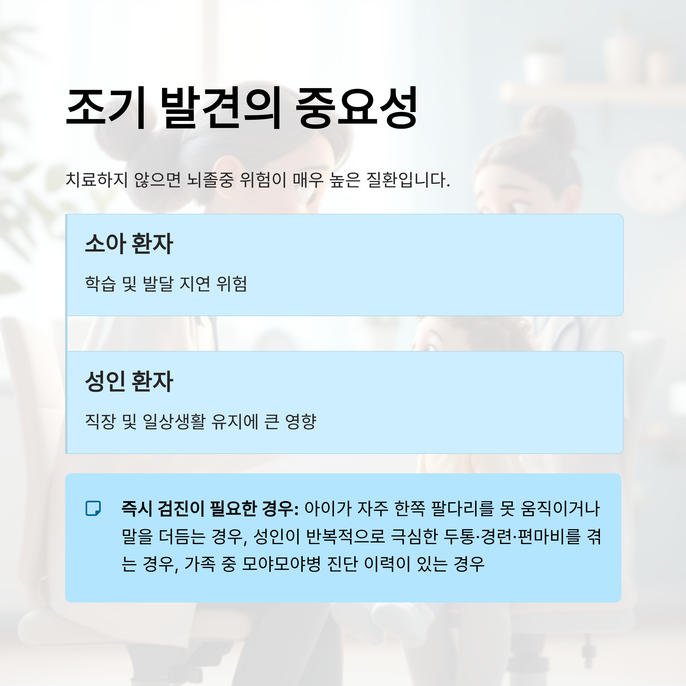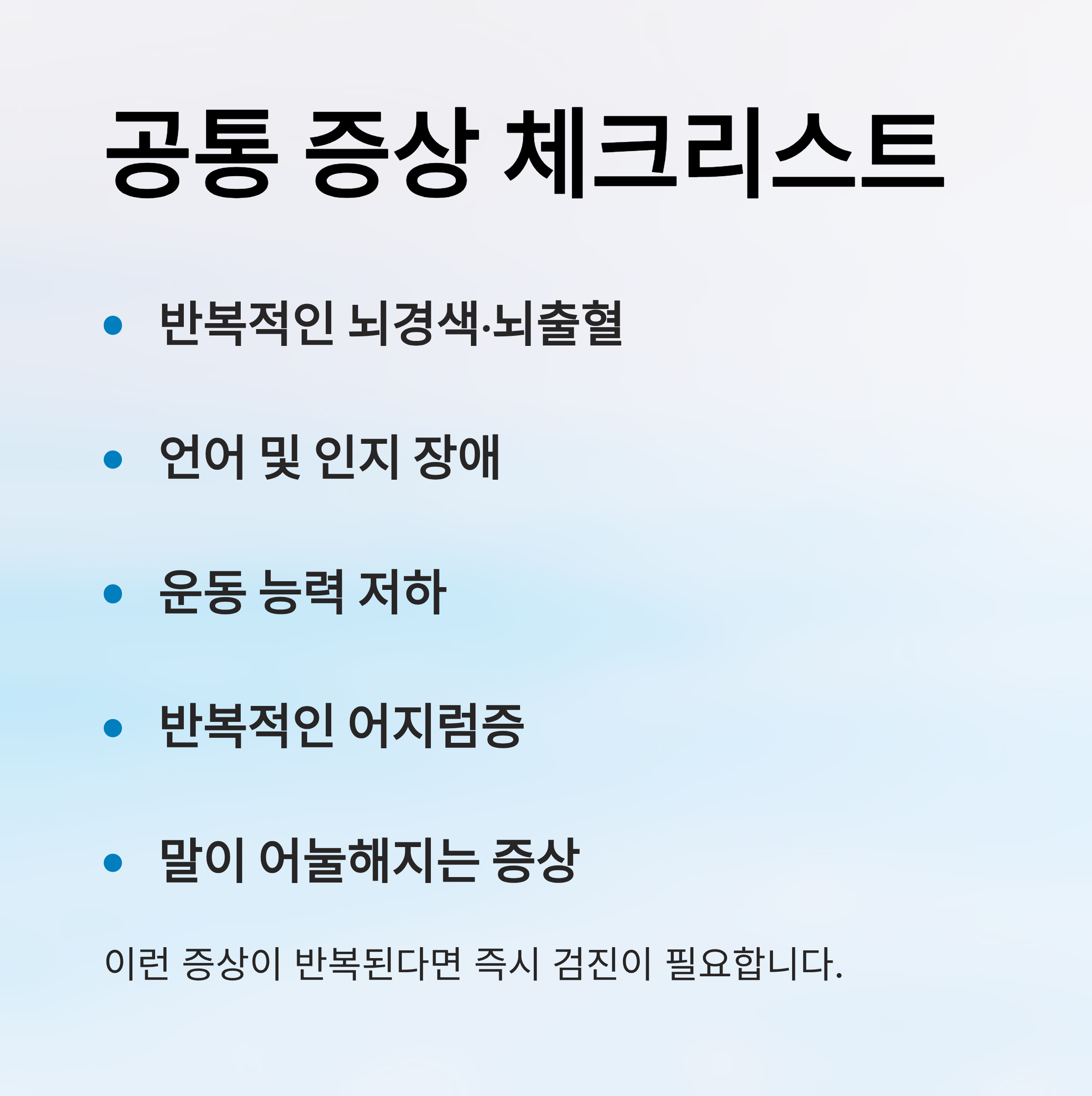 - 일상생활에서 반복적으로 어지럽거나 말이 어눌해지는 경우에도 의심 가능