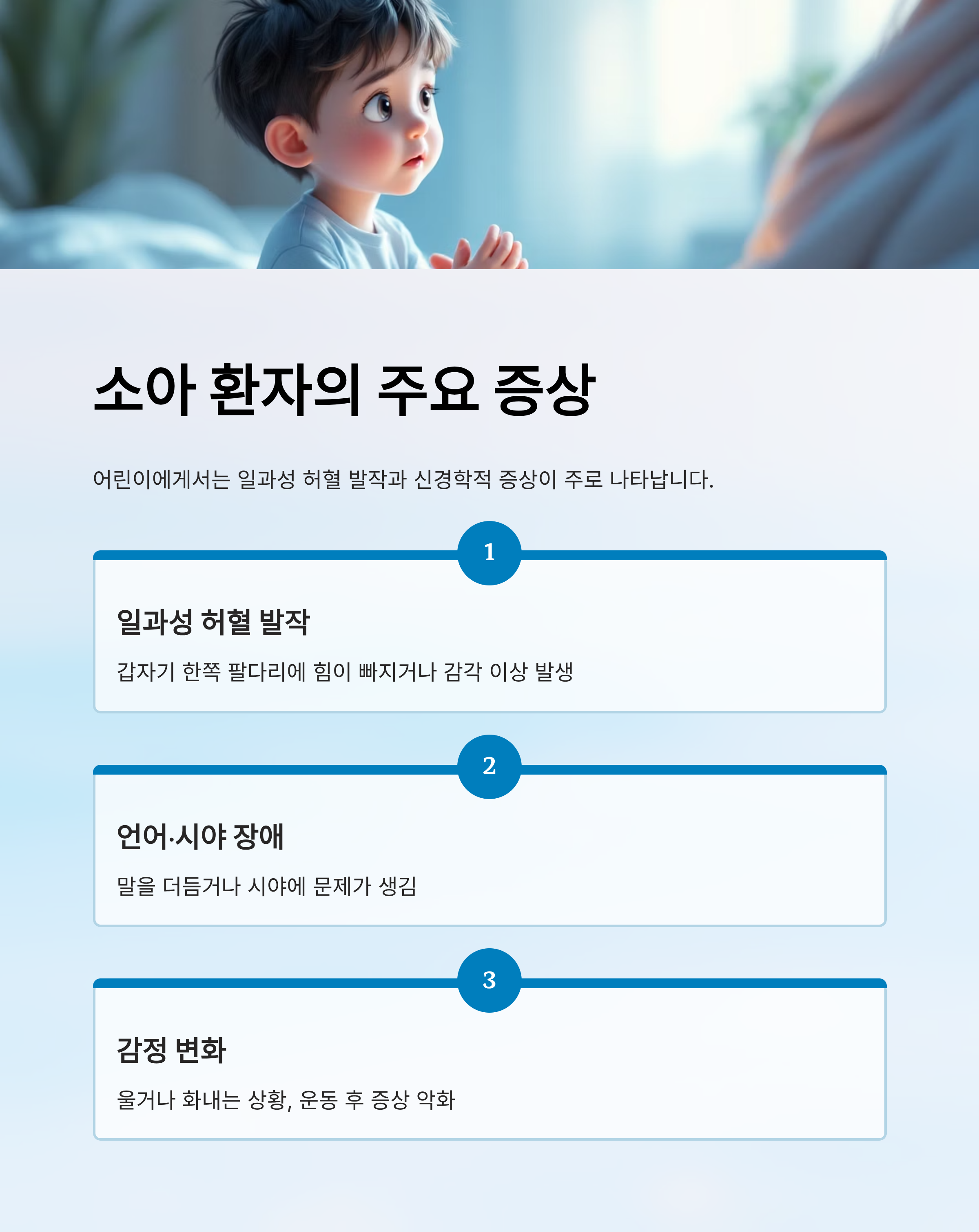 특히 어린 자녀가 갑자기 한쪽 팔다리를 못 움직이거나 말을 하지 못할 때, 단순 피로로 넘기지 말고 반드시 전문의의 진단을 받아보시길 권장드립니다.