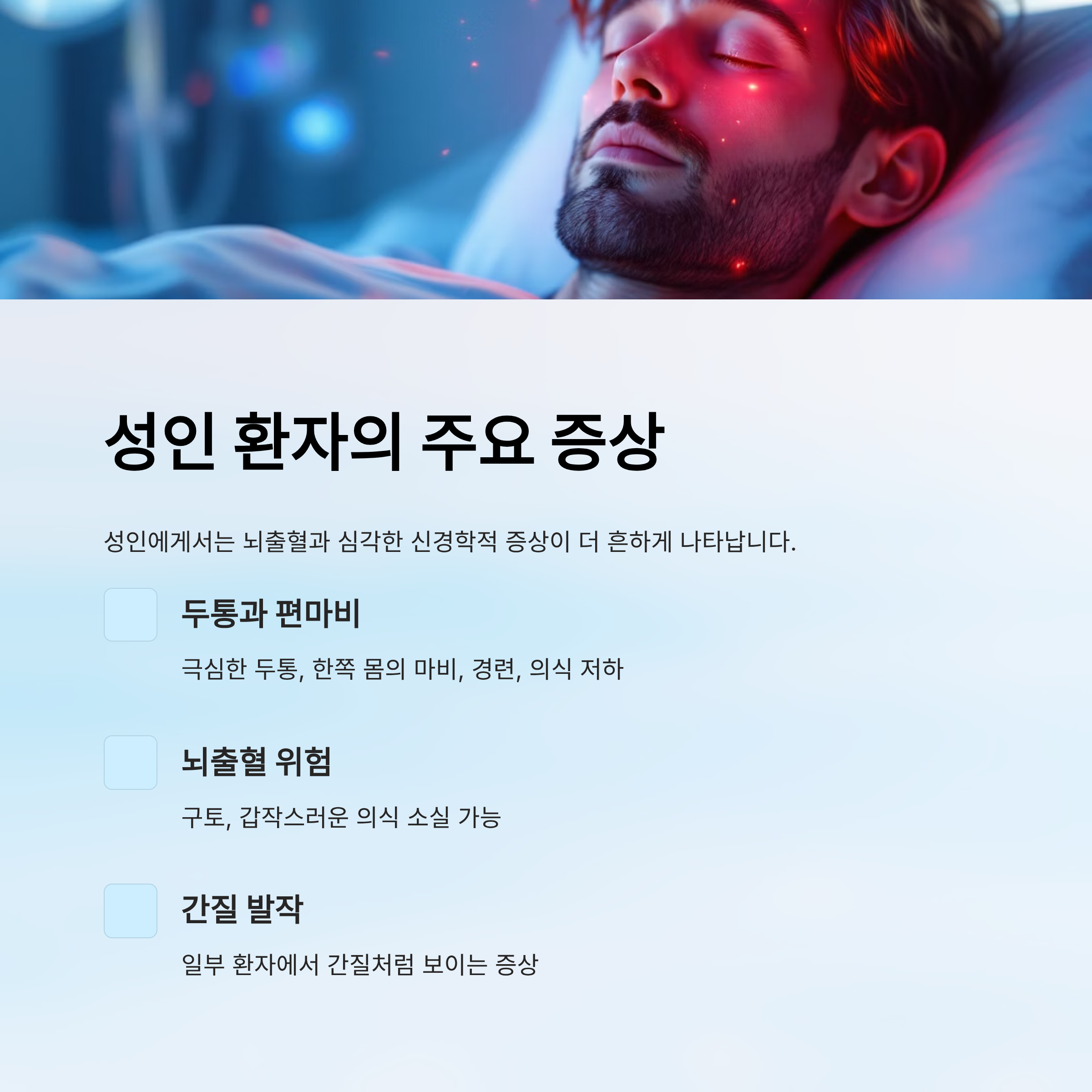 - 성인이 반복적으로 극심한 두통, 경련, 편마비를 겪는 경우