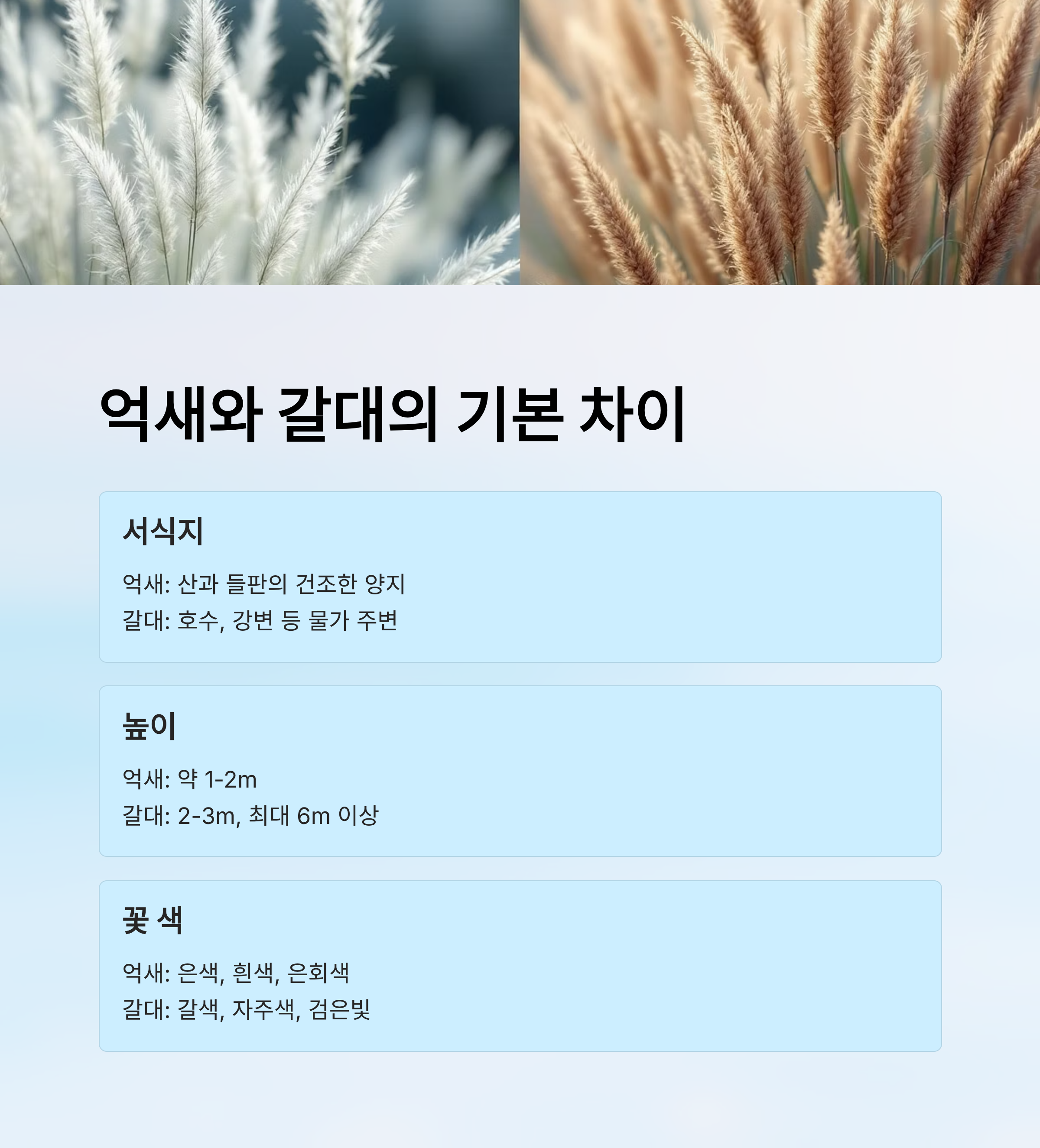 이번 글에서는 억새와 갈대의 서식지, 외형, 꽃 색, 잎의 질감, 개화 시기 등 차이점을 명확히 비교해드립니다. 현장에서 한눈에 알아볼 수 있도록 실용적인 기준도 함께 안내합니다.